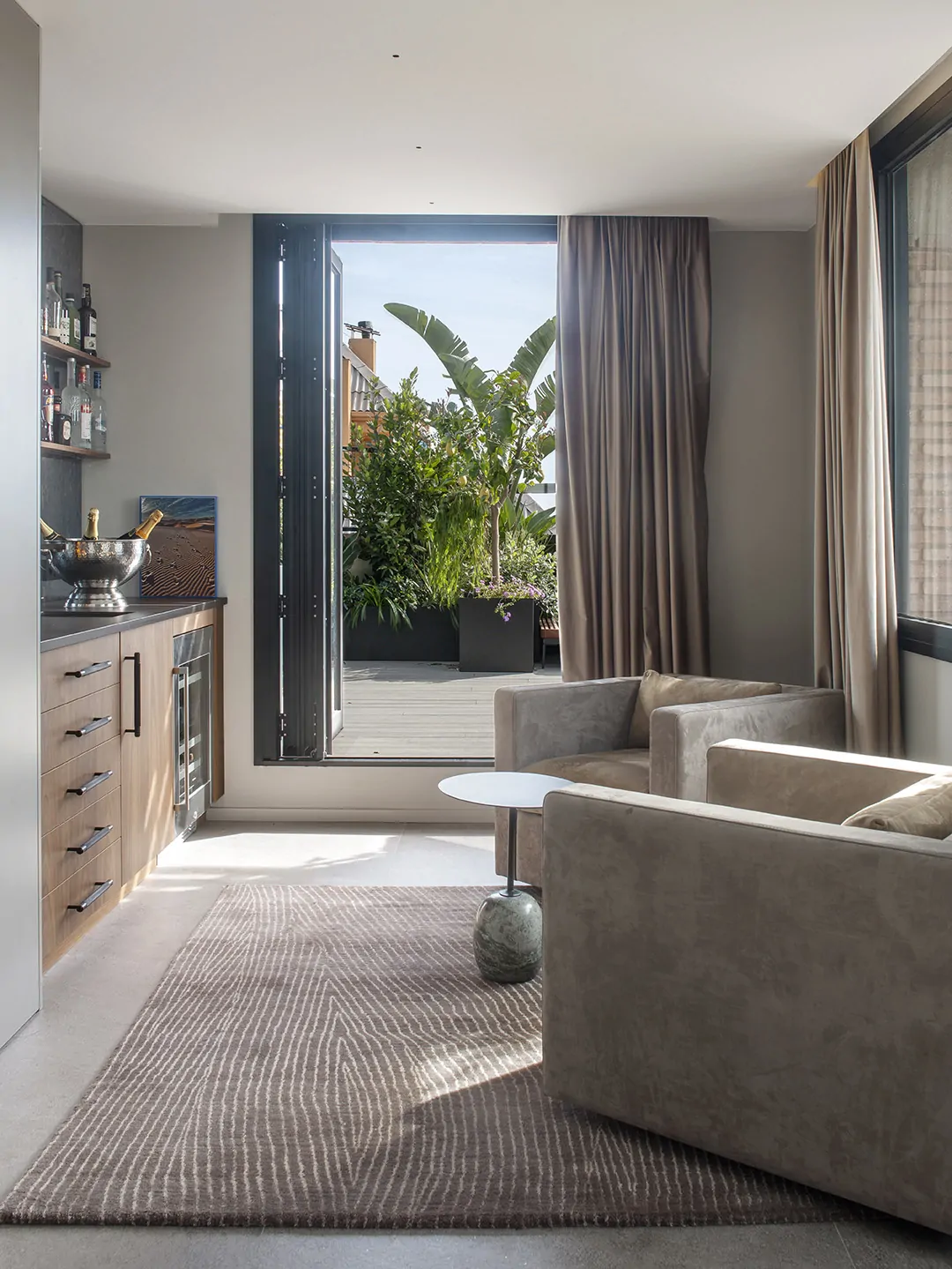 Junto a la salida a la terraza, aparece un elegante bar diseñado en nogal y laca, con espejo envejecido, grifería Dorn Bracht y vinoteca Gaggenau. Dos sillones de piel de M. Farrugia y una mesita Lato de &Tradition completan este pequeño oasis social.