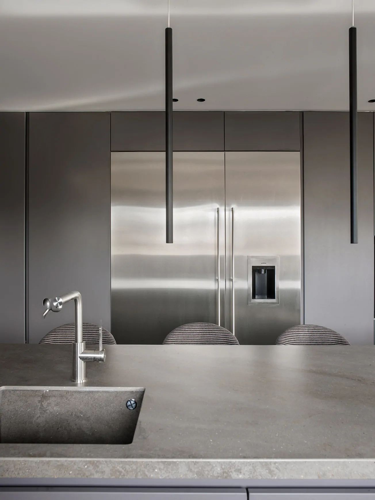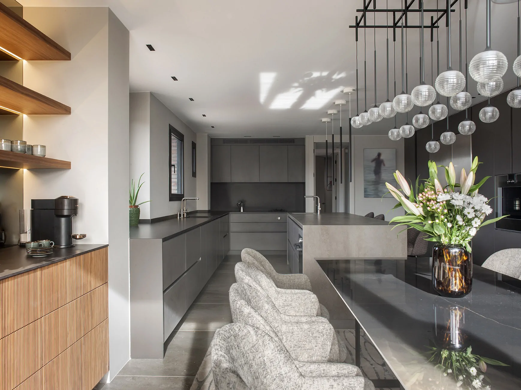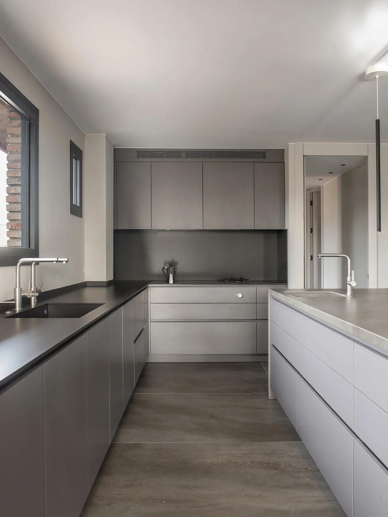 Concebida íntegramente a medida, la cocina en laca mate y electrodomésticos Gaggenau se organiza alrededor de una isla de casi cuatro metros, iluminada por lámparas Miss de Uno Iluminación. Las encimeras en porcelánico Inalco combinan dos acabados que diferencian sutilmente los usos: Gris Abujardado para la isla y Castagna para la zona de trabajo.