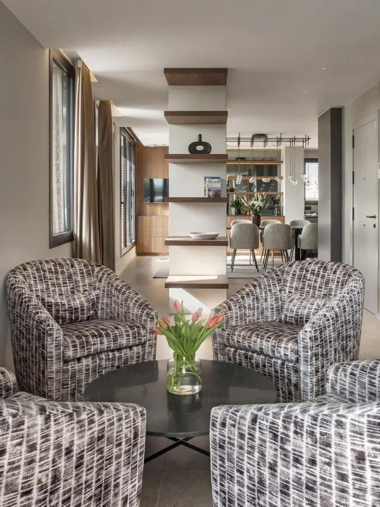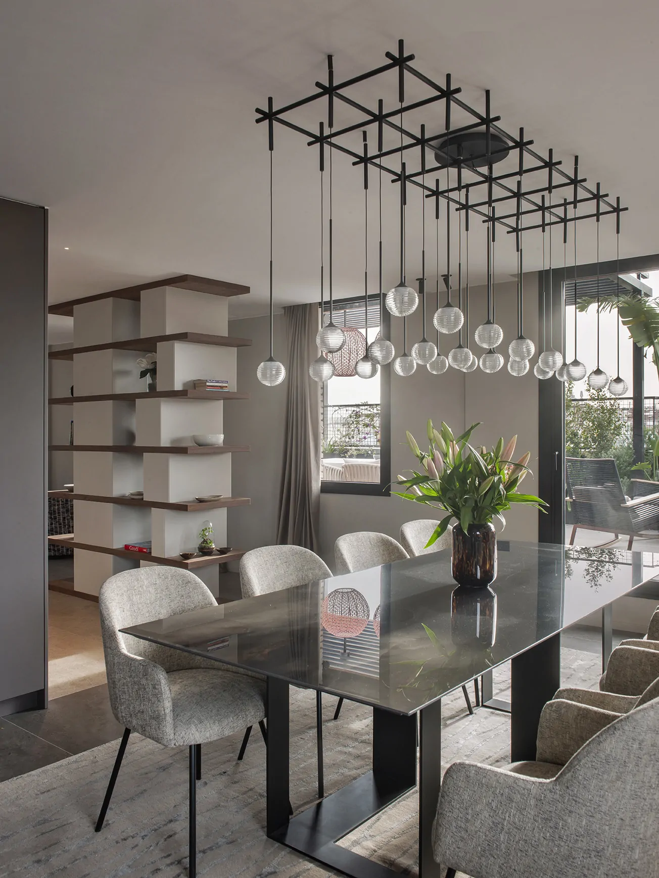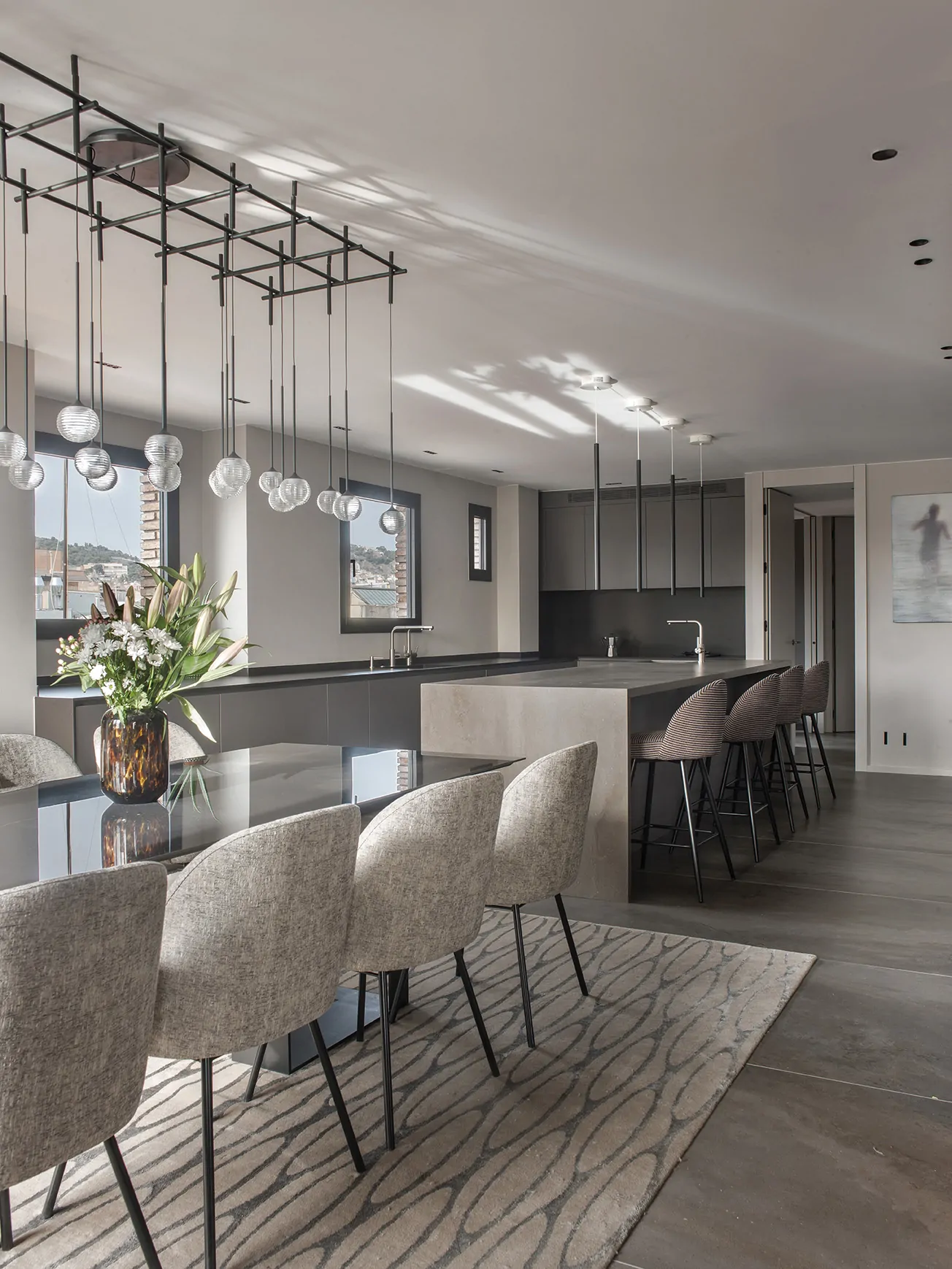 Frente al salón, la zona de comedor se estructura alrededor de una mesa diseñada a medida, con patas en hierro lacado negro y un sobre porcelánico brillante. La alfombra de Allegra Hicks para The Rug Company y las sillas tapizadas con tela Harrison crean un ambiente refinado. Un mueble de nogal con trasera de espejo ahumado amplía visualmente la estancia, mientras la lámpara Algorithm de Vibia ilumina el conjunto con una presencia escultórica.