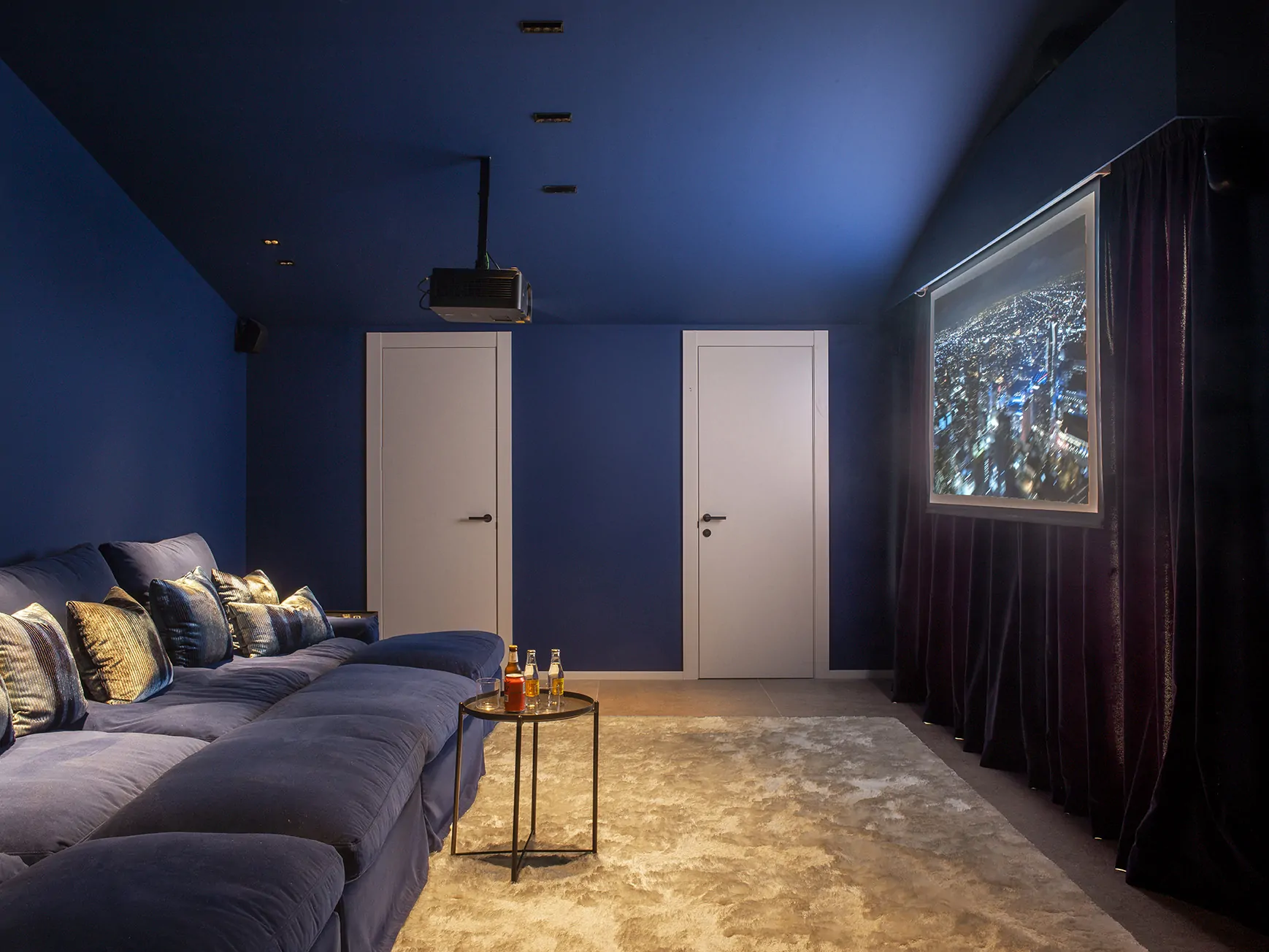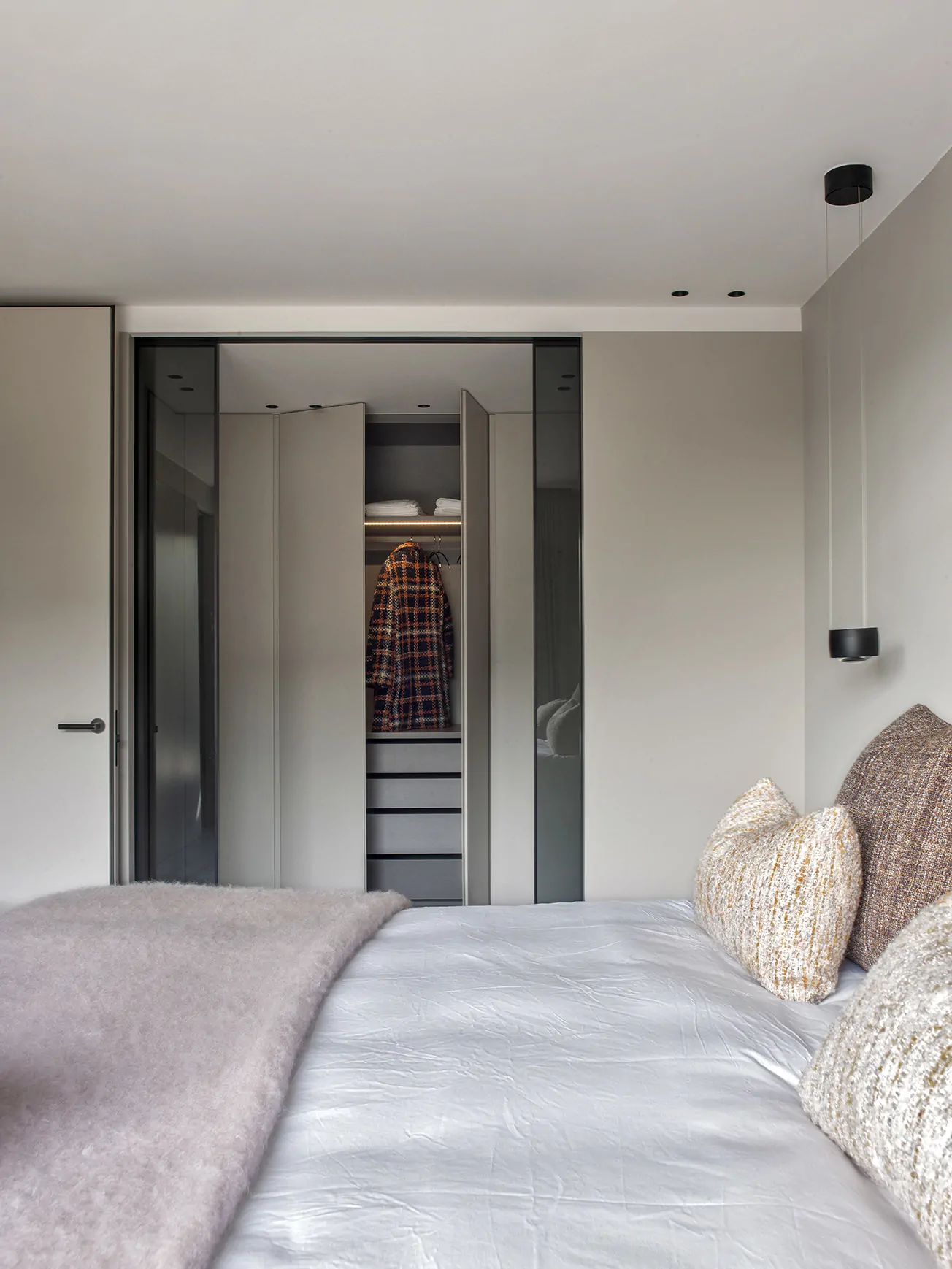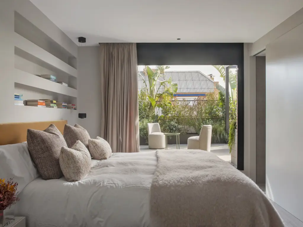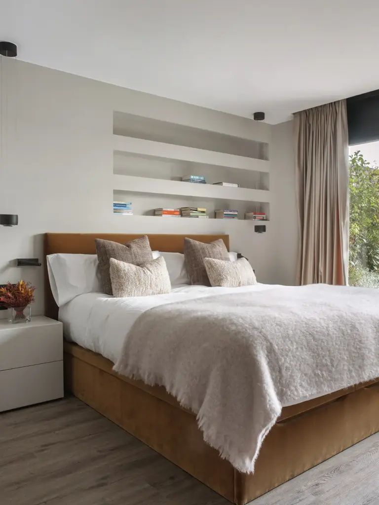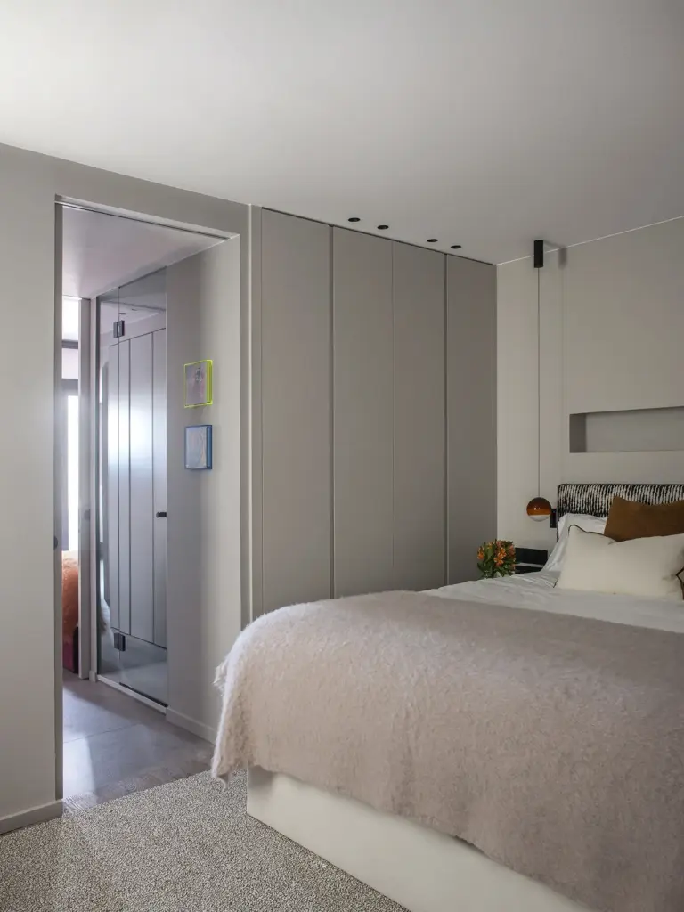 El dormitorio principal une un vestidor con puertas de cristal ahumado y un baño en suite. La cama tapizada en terciopelo Casamance se acompaña de cojines Alma y Caldera. La iluminación se resuelve con lámparas Occhio y apliques Mira Switch de Davide Groppi, mientras la alfombra Fingers Crossed de Monasch abraza el conjunto.