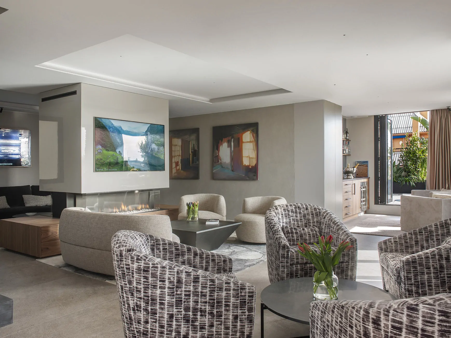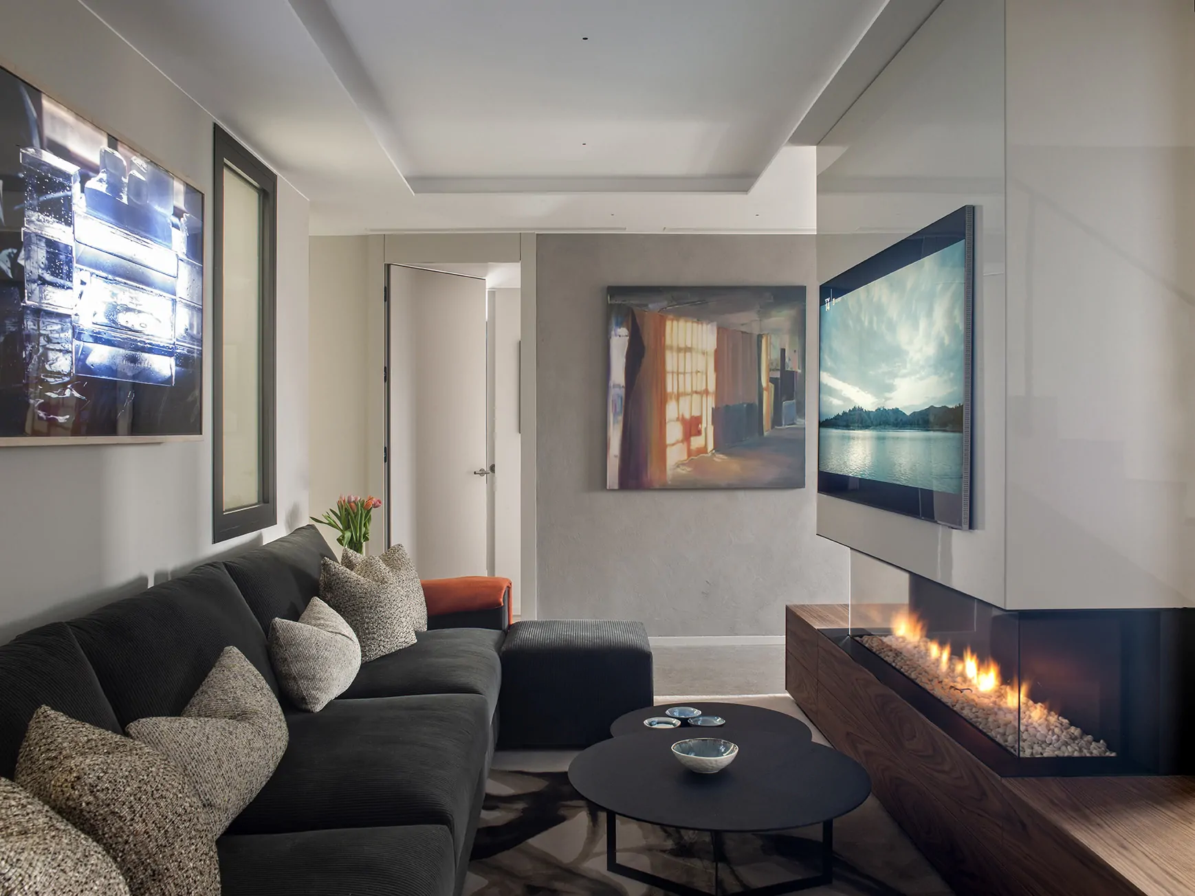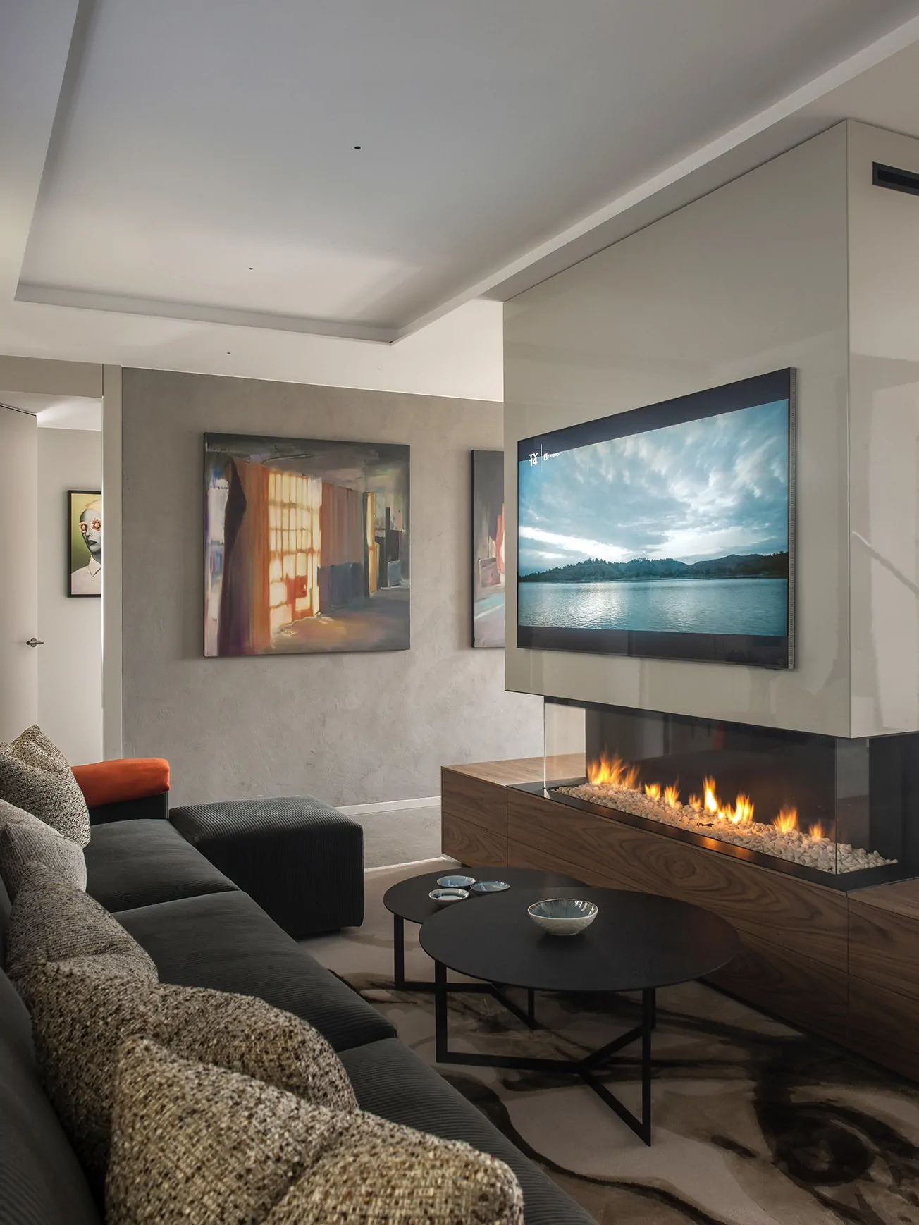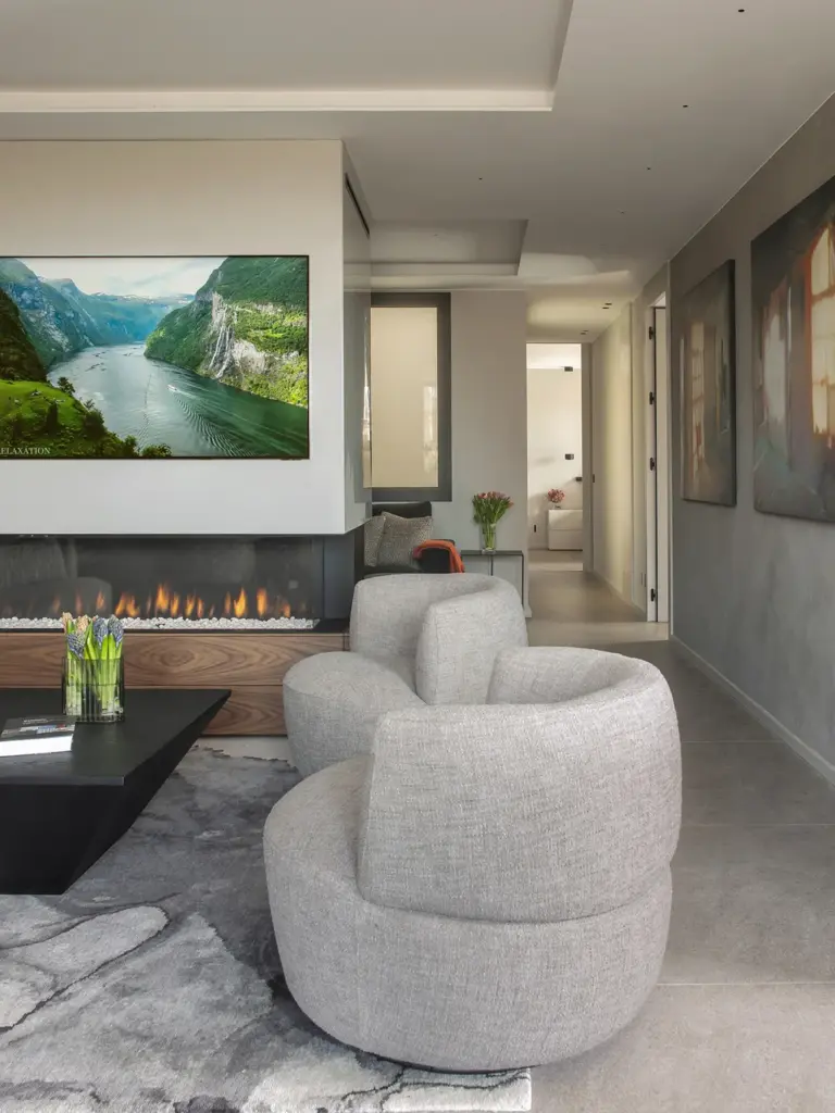 En el centro del espacio, un impresionante mueble de nogal lacado actúa como eje y separación. Integra una chimenea y una televisión de doble cara, permitiendo crear dos ambientes sin cerrar visualmente el espacio.