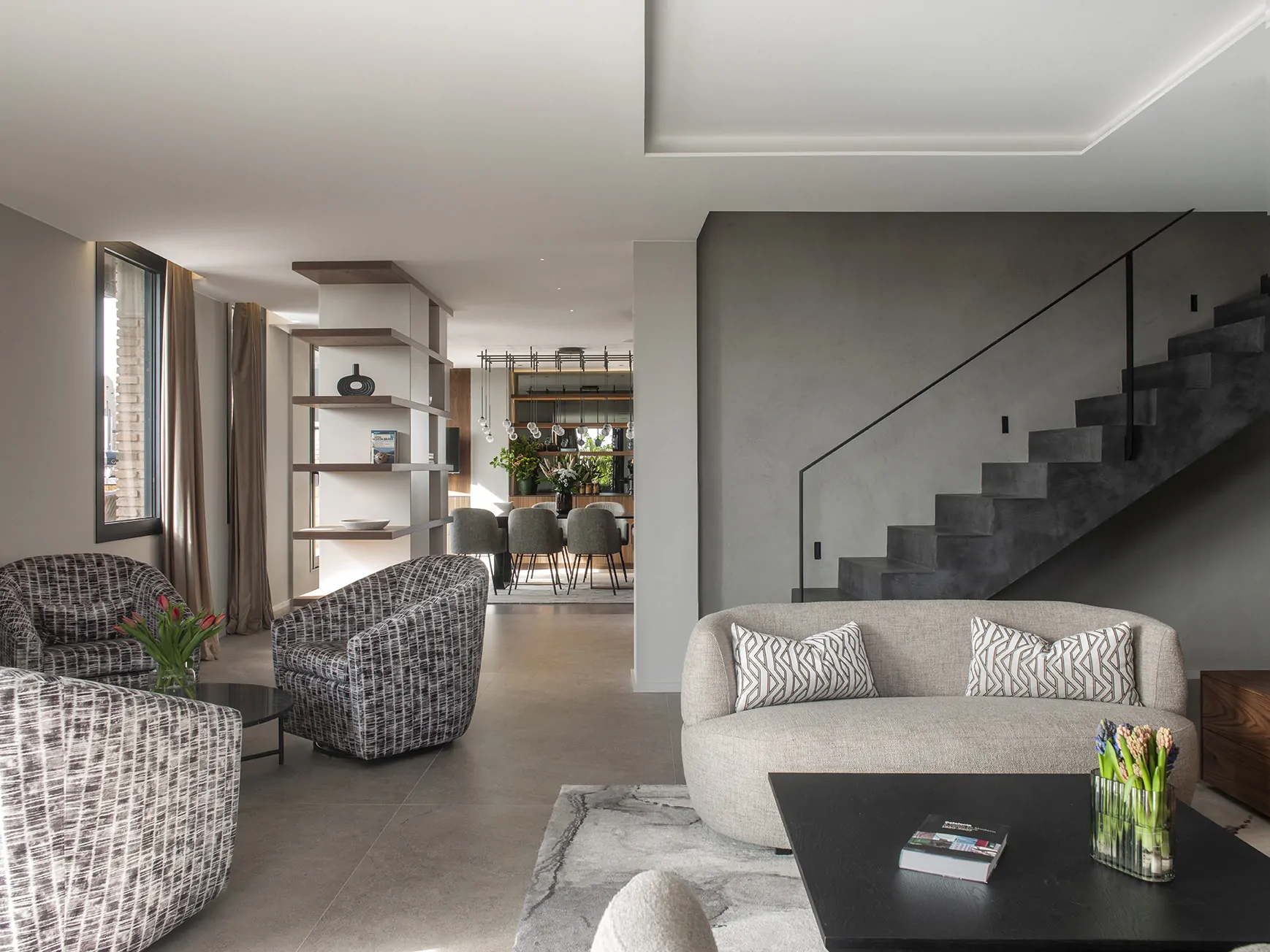 Al otro lado del mueble central, un sofá de gran formato con puffs a medida en tejido Cord de Jab Anstoetz se combina con mesas de hierro a dos alturas y cojines de Casamance. Las paredes en marmorino aportan un acabado artesanal que envuelve el espacio con sutileza.