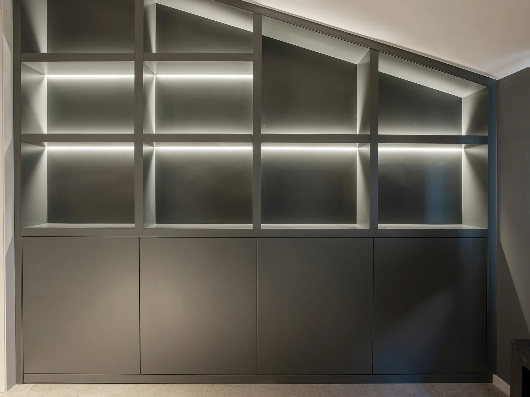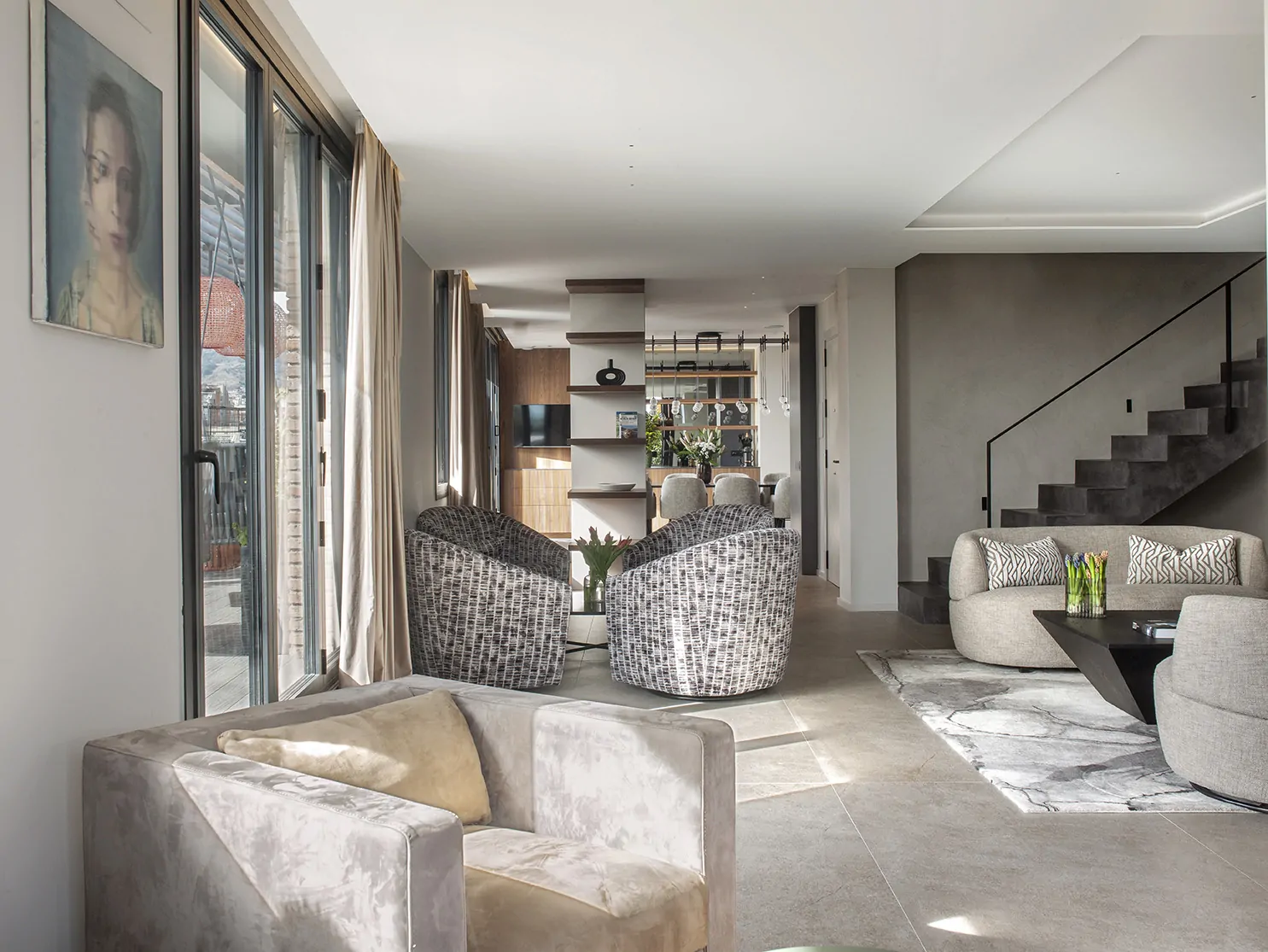 Una escalera en marmorino con barandilla ligera conduce a la planta superior: un despacho, un amplio salón con Home Cinema, un sofá a medida y un baño completo. Todo el mobiliario está diseñado por el estudio.