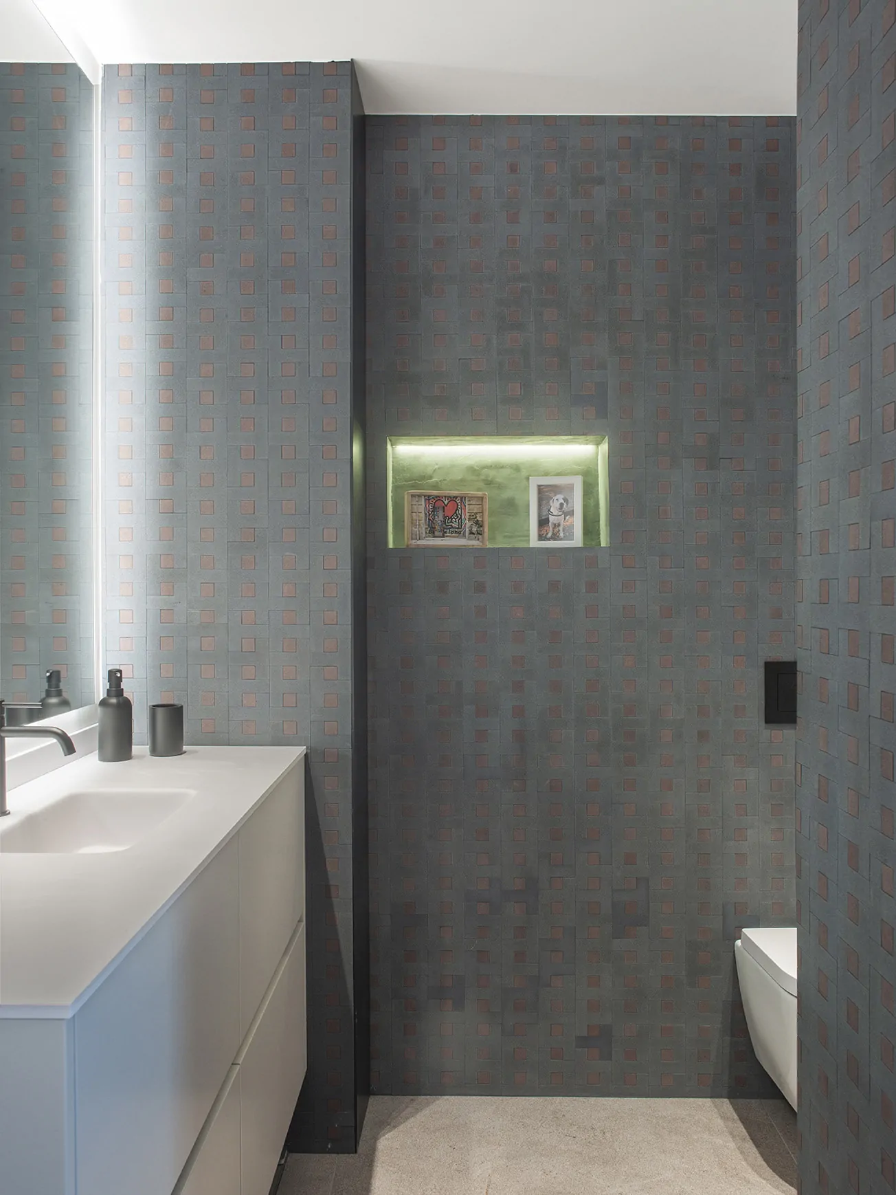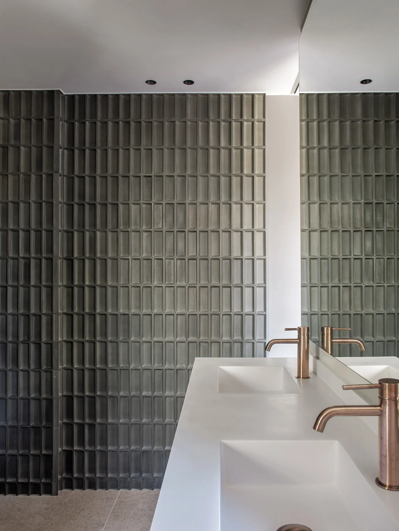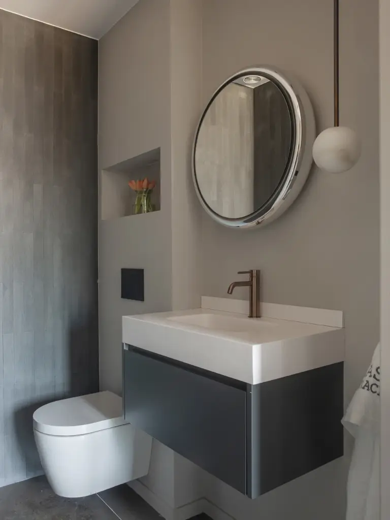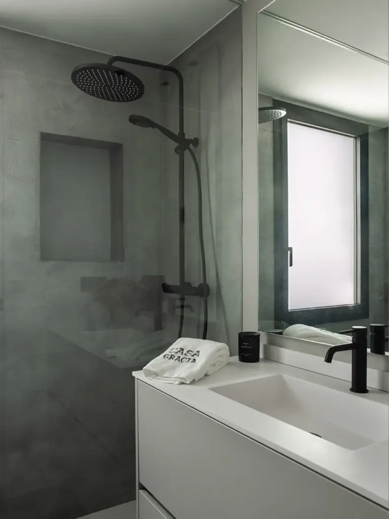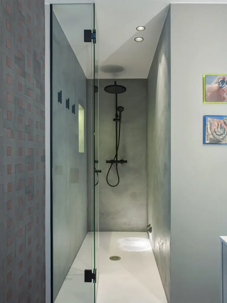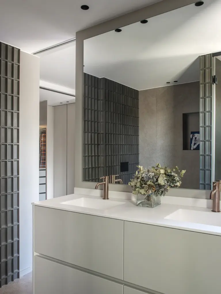 El baño combina un sistema hammam de Effegibi con piezas artesanales de Gypsum-Arte y grifería Rovira en cobre.