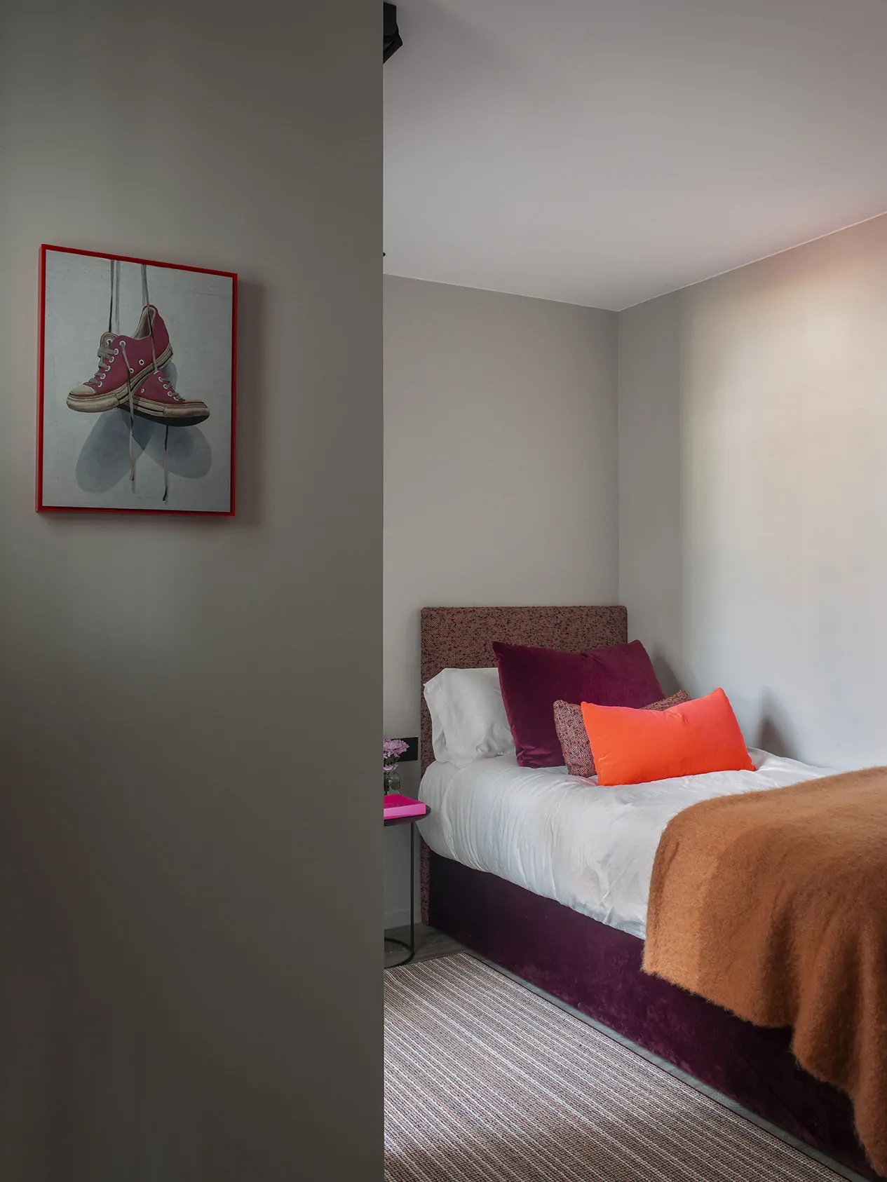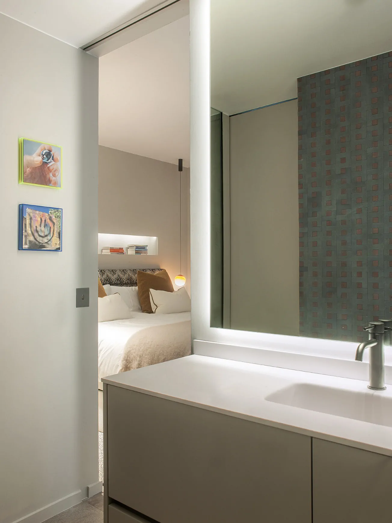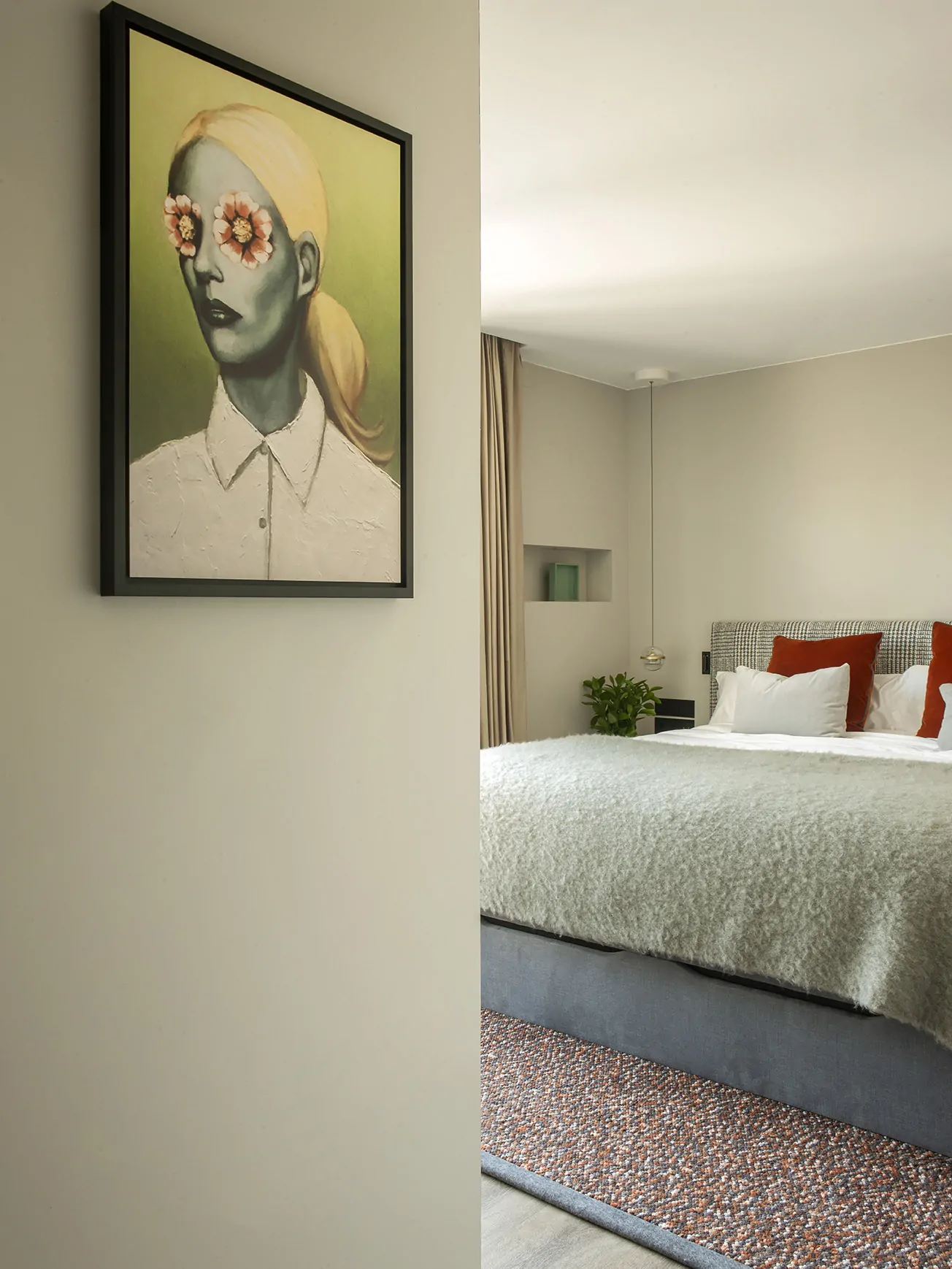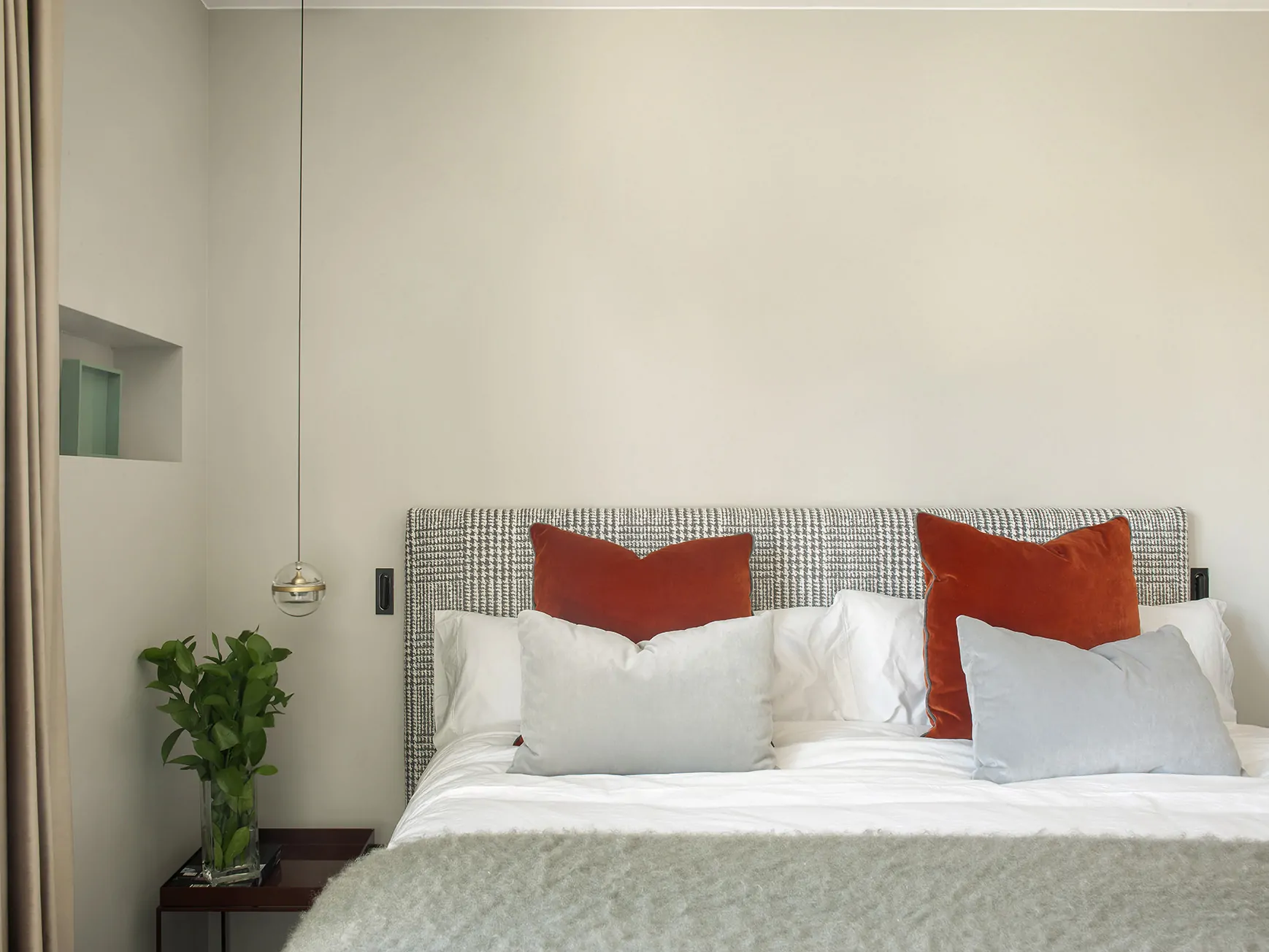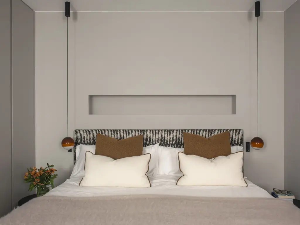Con cabezal tapizado en Quiberon de Jab Anstoetz, cojines Linara, alfombra Spaced Out de Monasch y mesitas Hay. La iluminación se resuelve con piezas de Lumina y Marset. El baño mezcla revestimientos Gypsum-Arte con marmorino y grifería Rovira en negro.