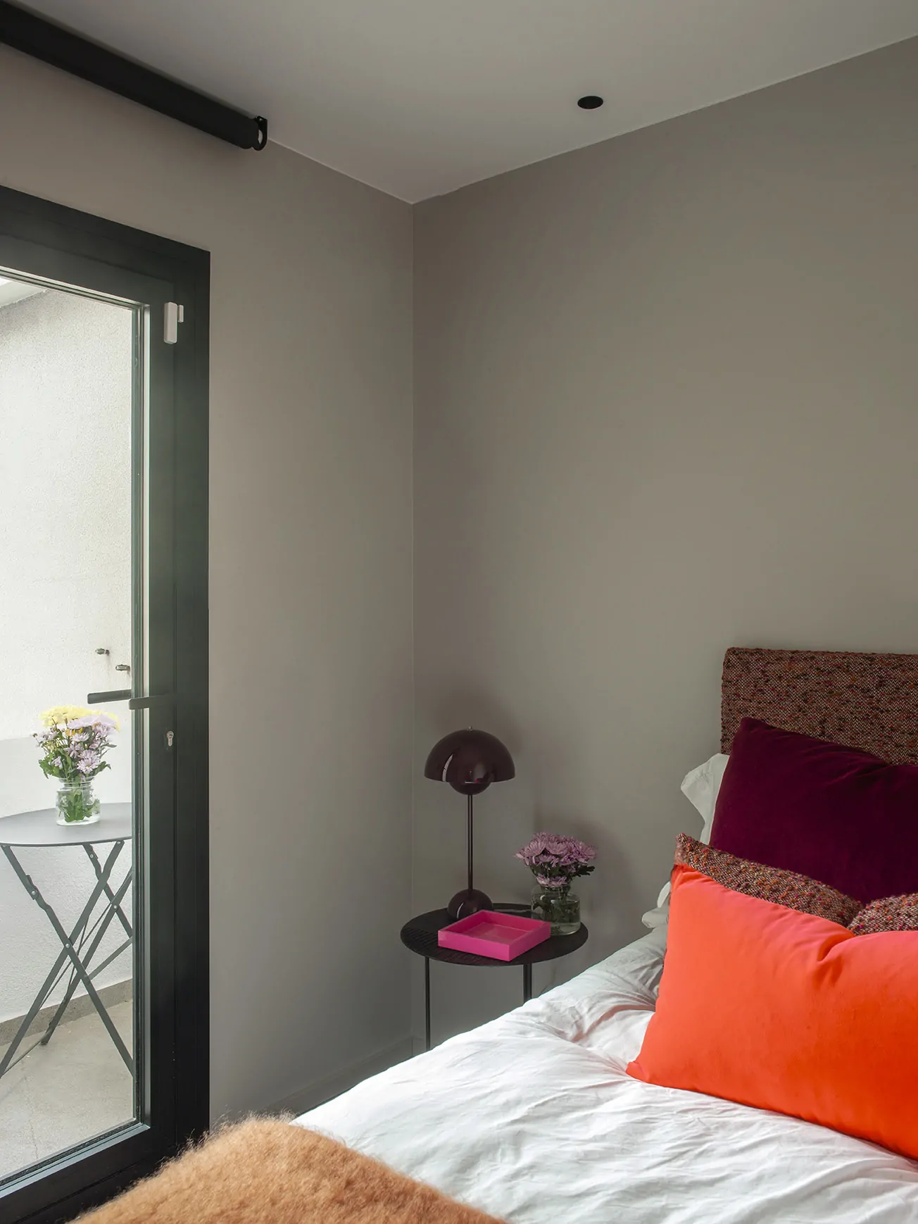 Más relajada, con cama nido tapizada en Nebraska de Güell, mesita Ethnicraft y lámpara Flowerpot de Verner Panton.