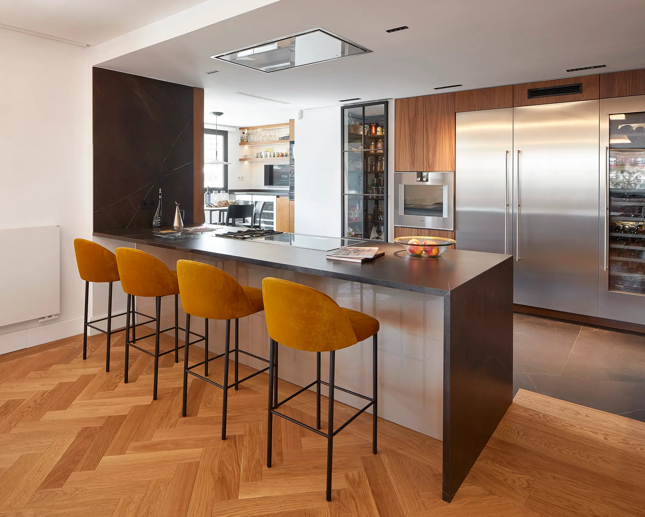 En el comedor interior, bajo las icónicas lámparas de Flos, una mesa de roble macizo convive con sillas tapizadas en tejidos de Güell Lamadrid, en un ambiente cálido y natural que da continuidad a la cocina abierta. Esta cocina se mimetiza con la arquitectura interior gracias a un mobiliario en nogal diseñado a medida por Verónica Mimoun, que incluye una gran península con inducción total y fuegos a gas de Gaggenau. En la parte derecha, la zona de aguas cuenta con fregadero integrado en el mismo porcelánico que reviste la península y el pavimento, todo en formato XL. La despensa, revestida con el clásico metro tile y estanterías de hierro, se cierra con una puerta de cuarterones en hierro.