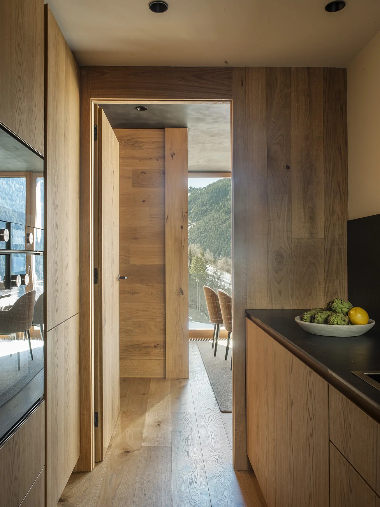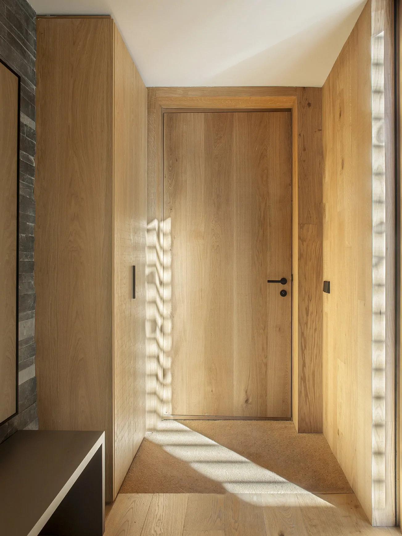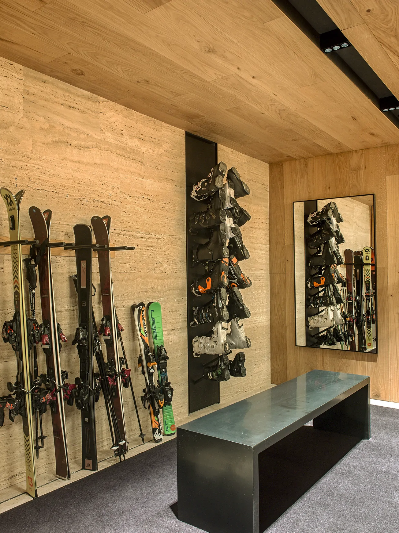En el acceso desde el garaje, se encuentra el ski room: un espacio imprescindible en una casa de alta montaña. Equipado con banco de Corian negro y alfombra antideslizante, ha sido diseñado para ofrecer todas las comodidades necesarias tras un día de esquí, sin renunciar a la estética depurada y funcional que caracteriza todo el proyecto.