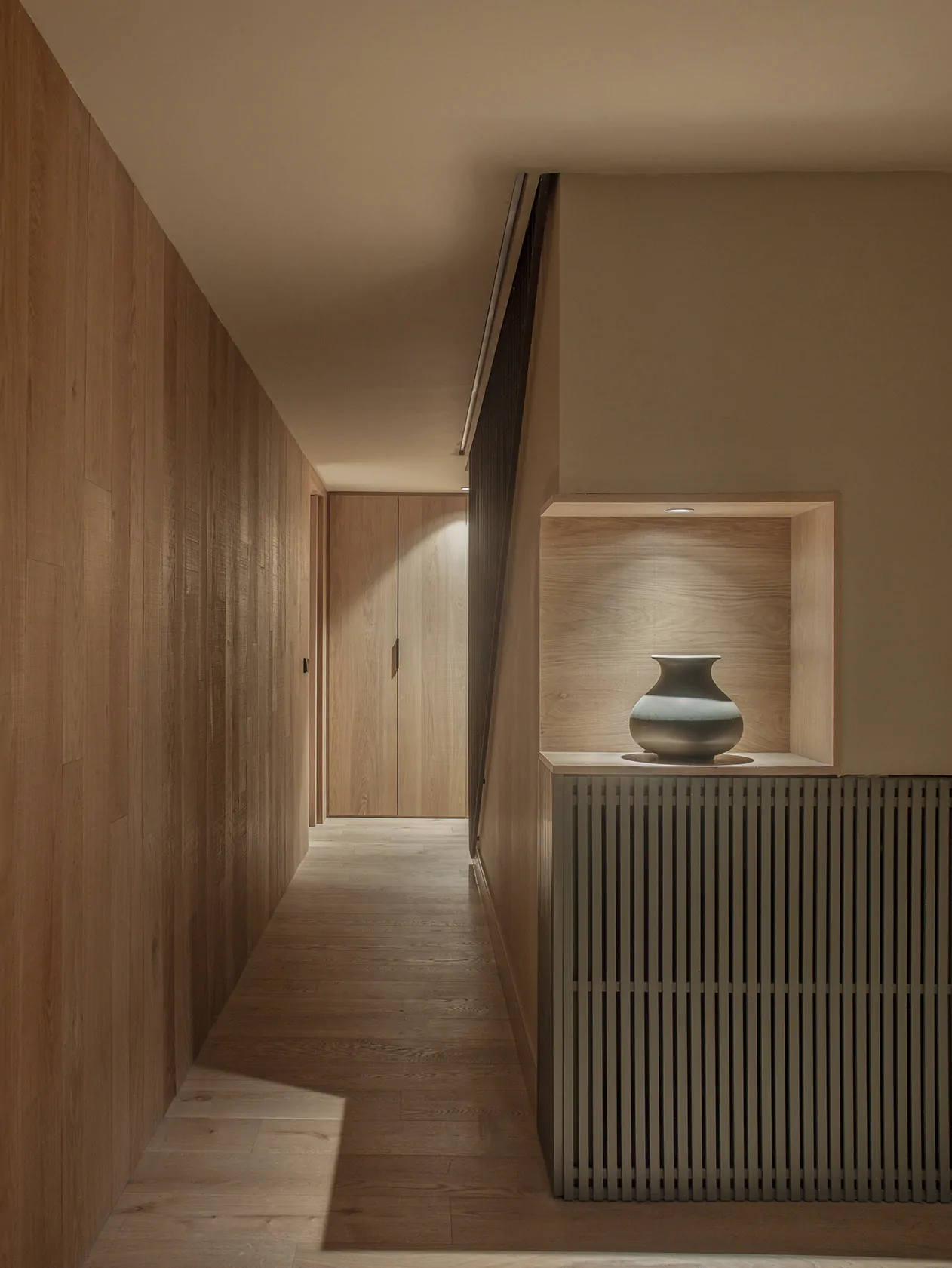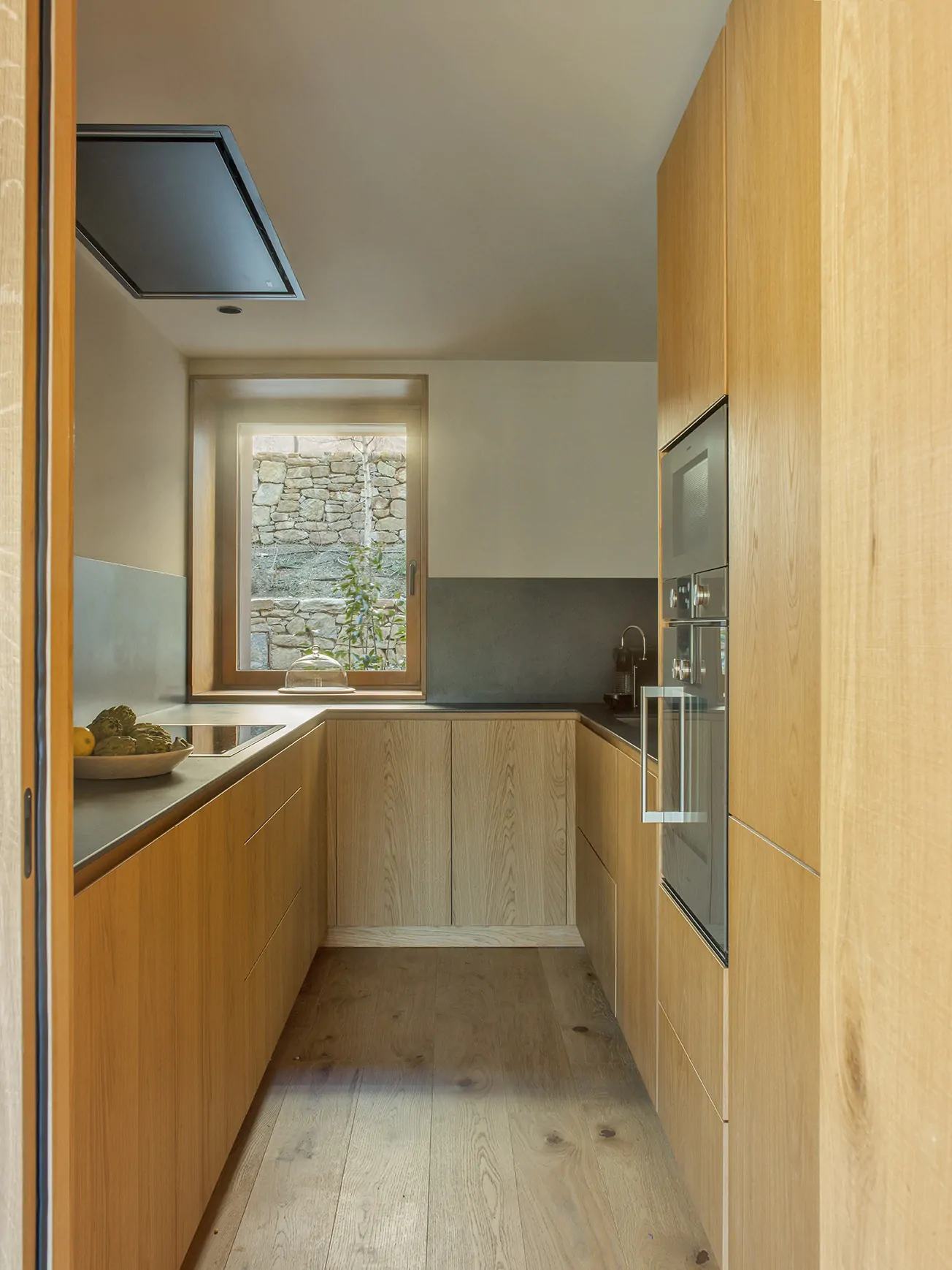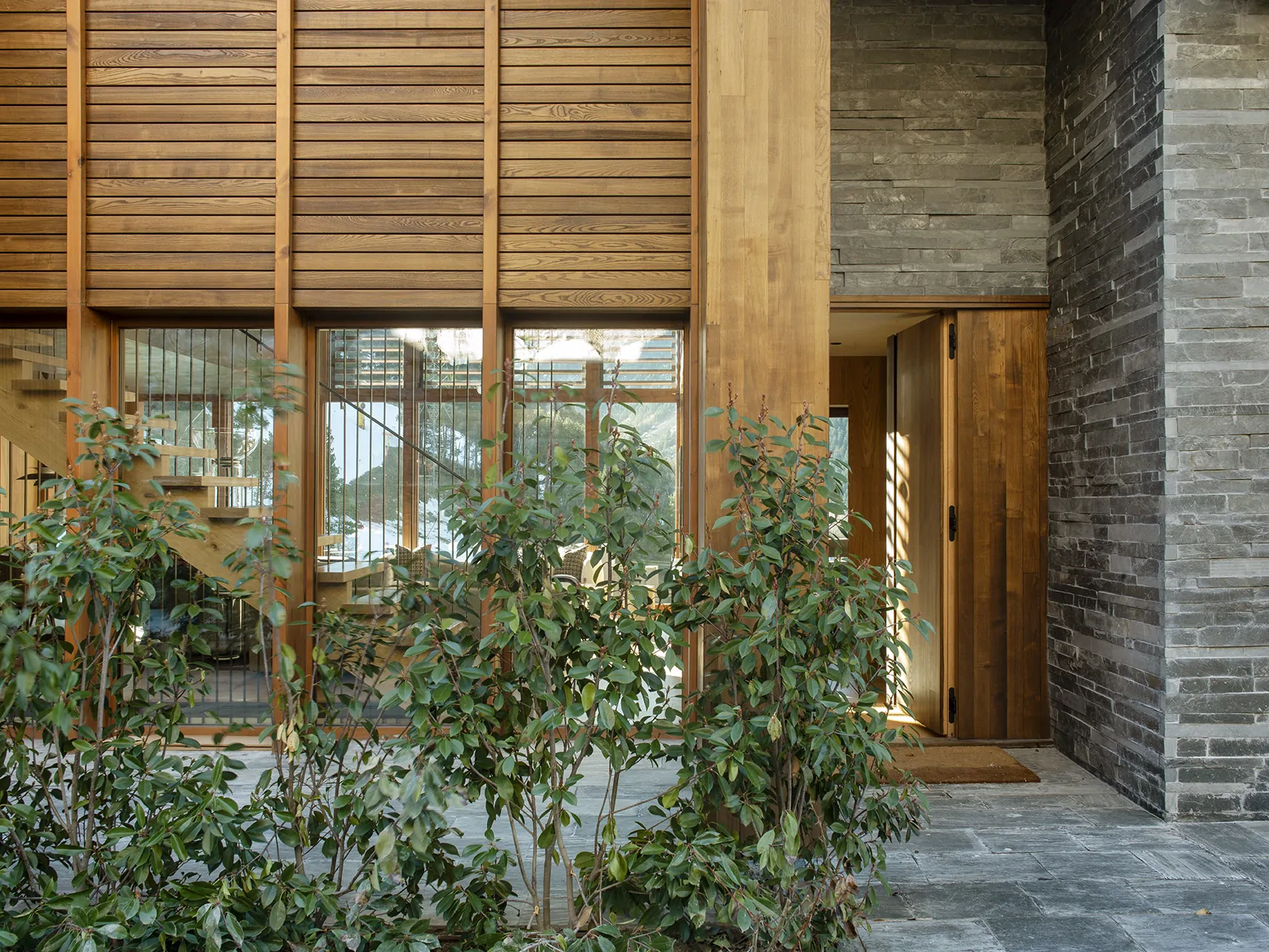 En el acceso desde el garaje, se encuentra el ski room: un espacio imprescindible en una casa de alta montaña. Equipado con banco de Corian negro y alfombra antideslizante, ha sido diseñado para ofrecer todas las comodidades necesarias tras un día de esquí, sin renunciar a la estética depurada y funcional que caracteriza todo el proyecto.