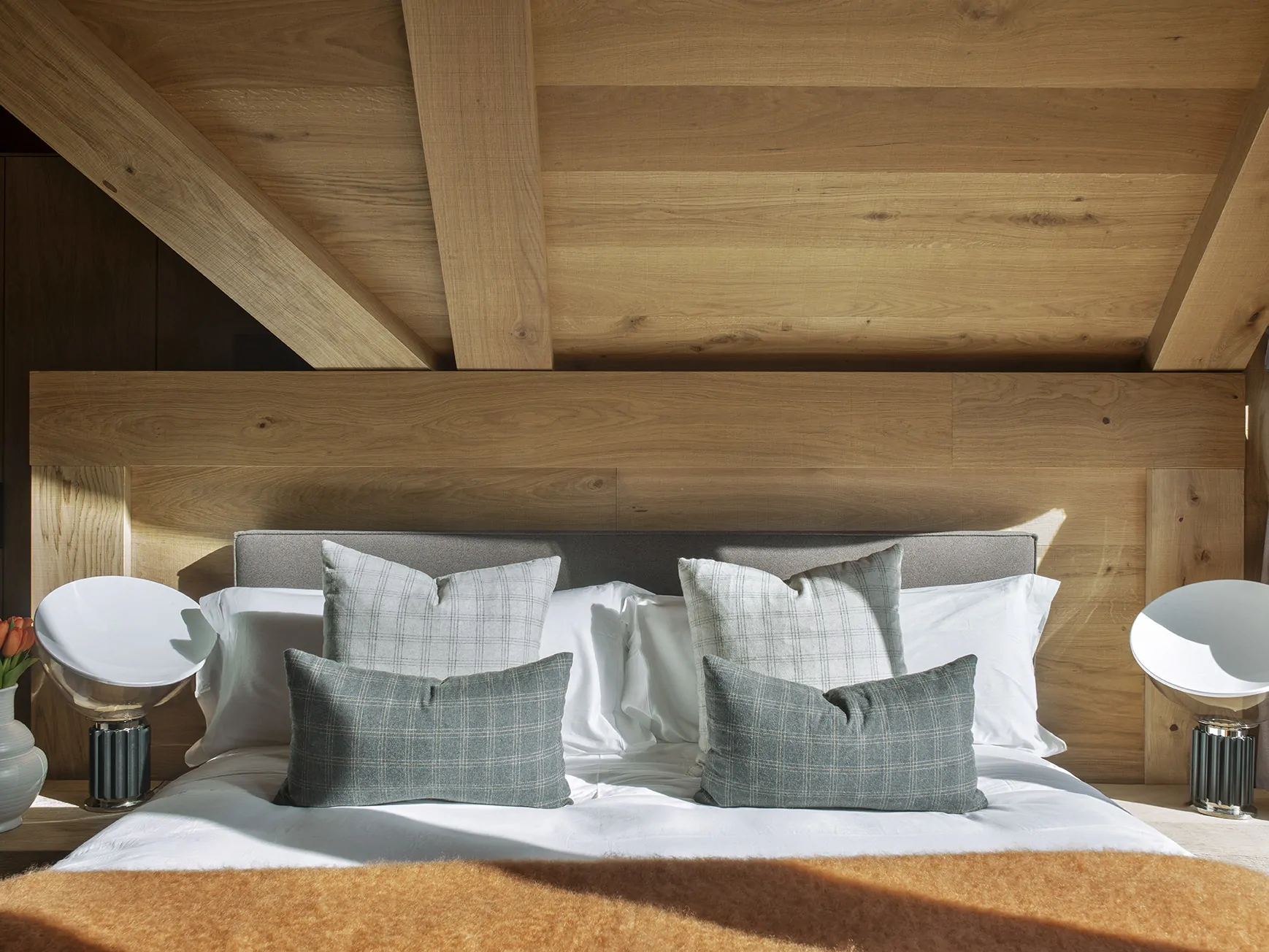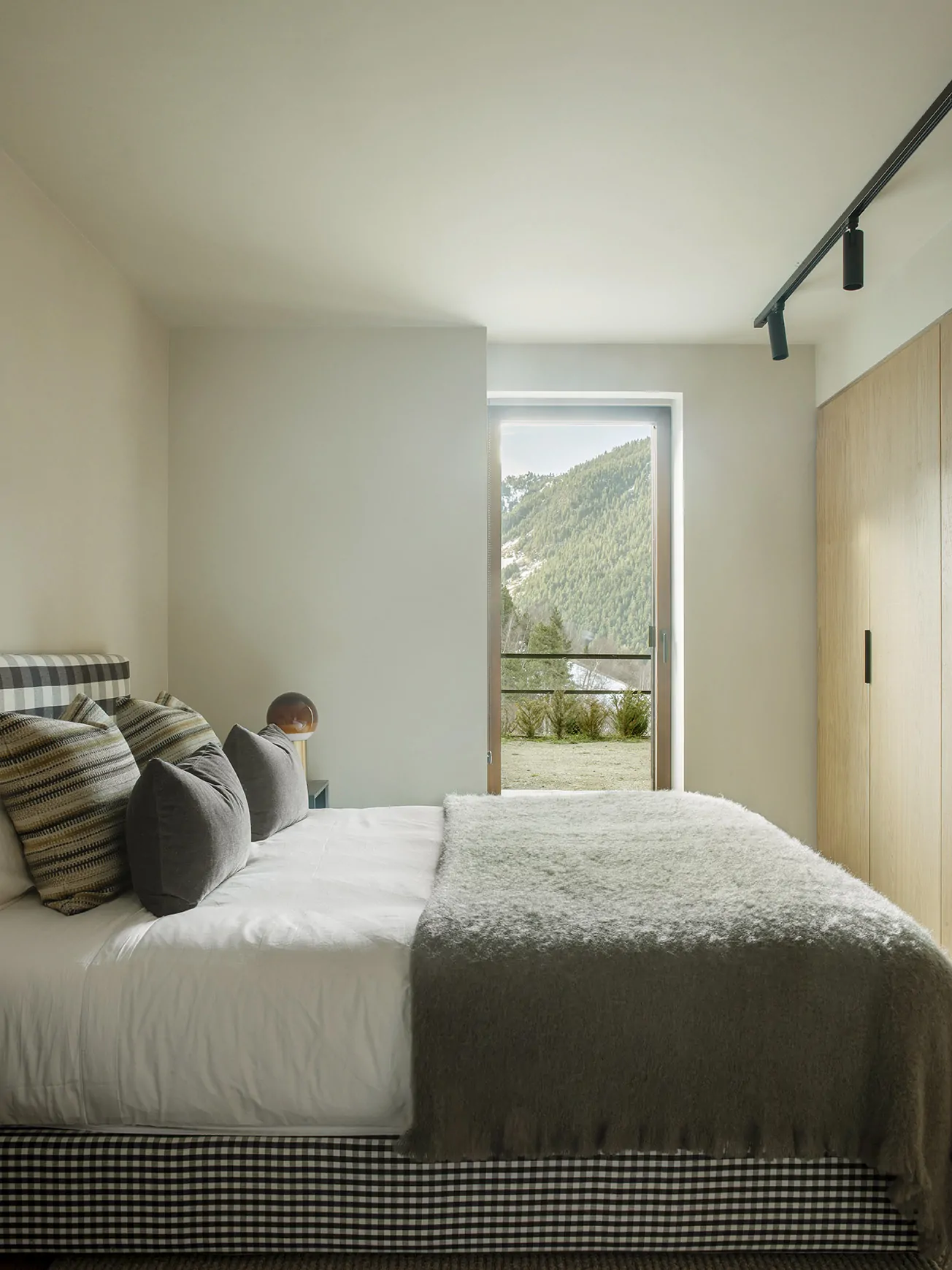 Subiendo a la planta superior, el dormitorio principal con baño en suite se convierte en un refugio de descanso absoluto. La cama, con cabecero realizado a medida, se viste con cojines decorativos y una manta en tono caldera sobre una alfombra de lana merino blanca. Las mesitas de noche, fabricadas en roble de hierro, se combinan con lámparas de Flos que añaden un toque de humor sutil. Una pequeña zona de lectura, con sillón tapizado y otra lámpara de pie, invita a la pausa y al recogimiento con vistas a las montañas.