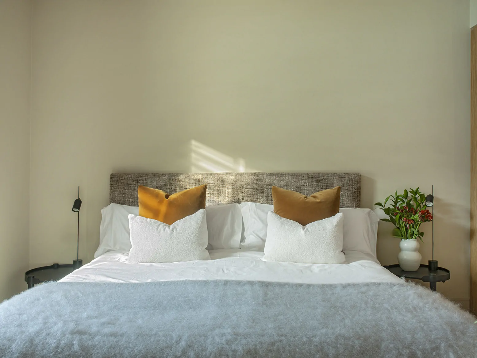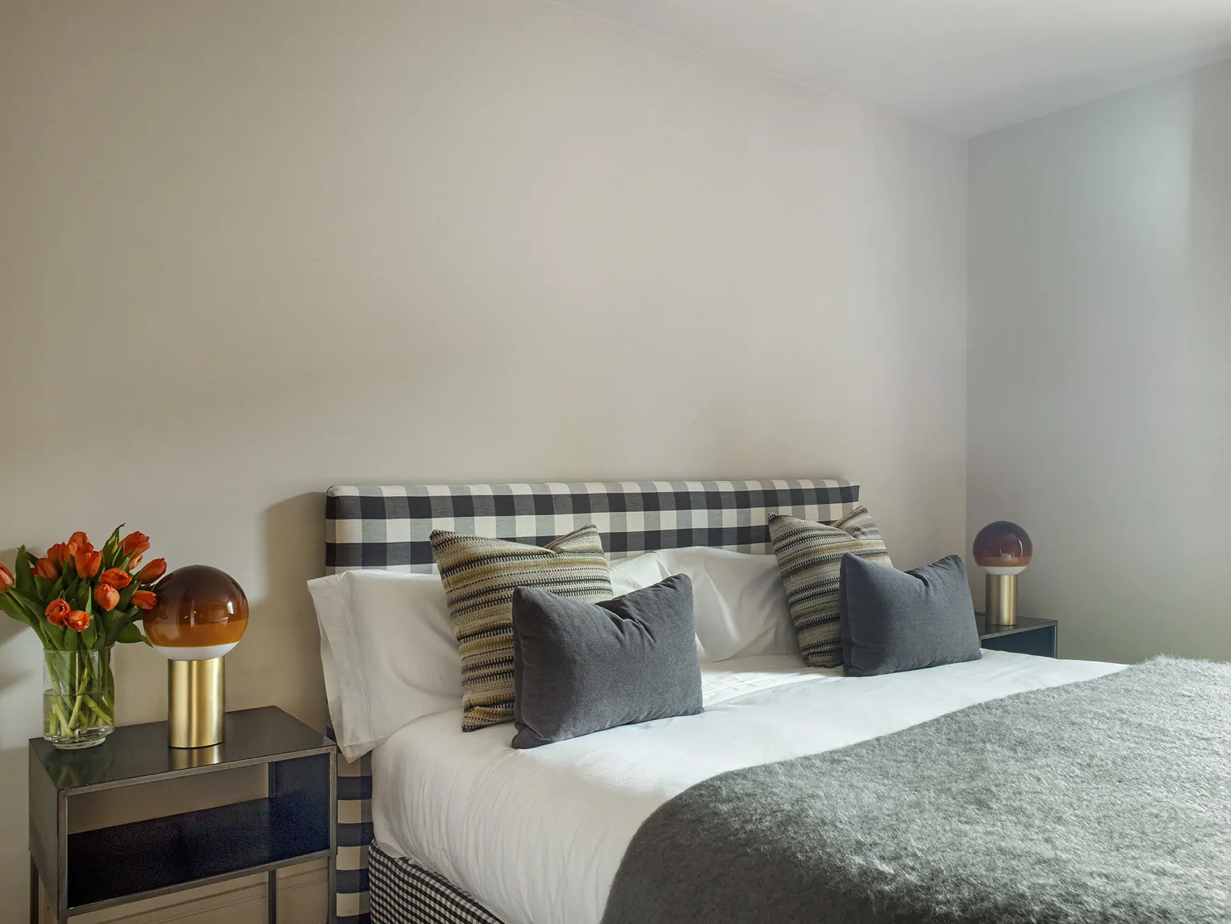 En otro dormitorio, la cama de matrimonio está tapizada con una elegante tela de James Malone y se acompaña de cojines decorativos coordinados.