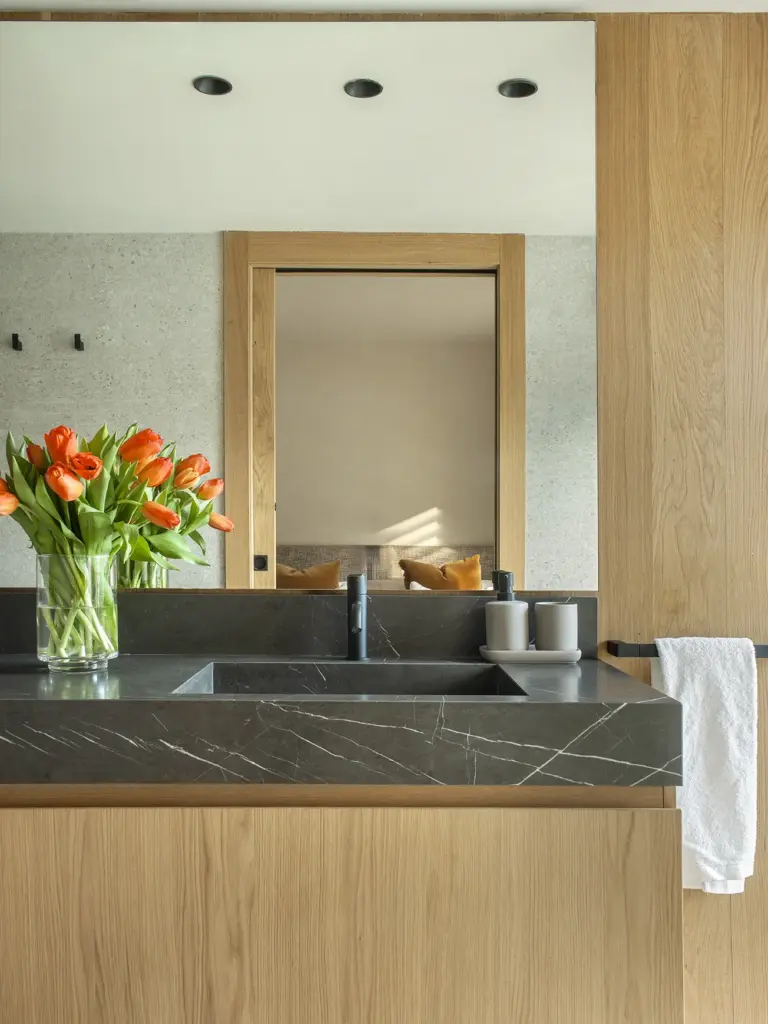 Desde el primer momento, el vestíbulo recibe al visitante con una mezcla de nobleza y calidez: madera de roble y piezas de pizarra se combinan con un banco lacado a medida diseño de Verónica Mimoun y un espejo también diseñado exclusivamente para este espacio. Tras dejar los abrigos en el armario oculto, se accede a la planta principal, donde se abre un amplio salón a doble altura que conecta visualmente con el comedor.