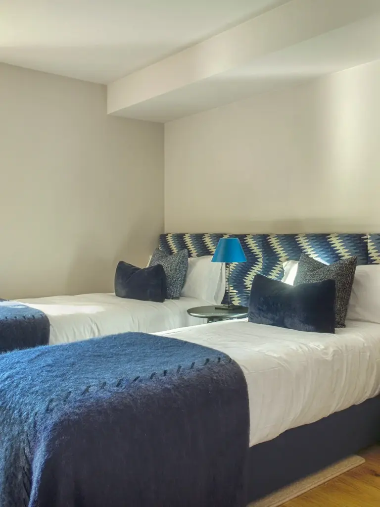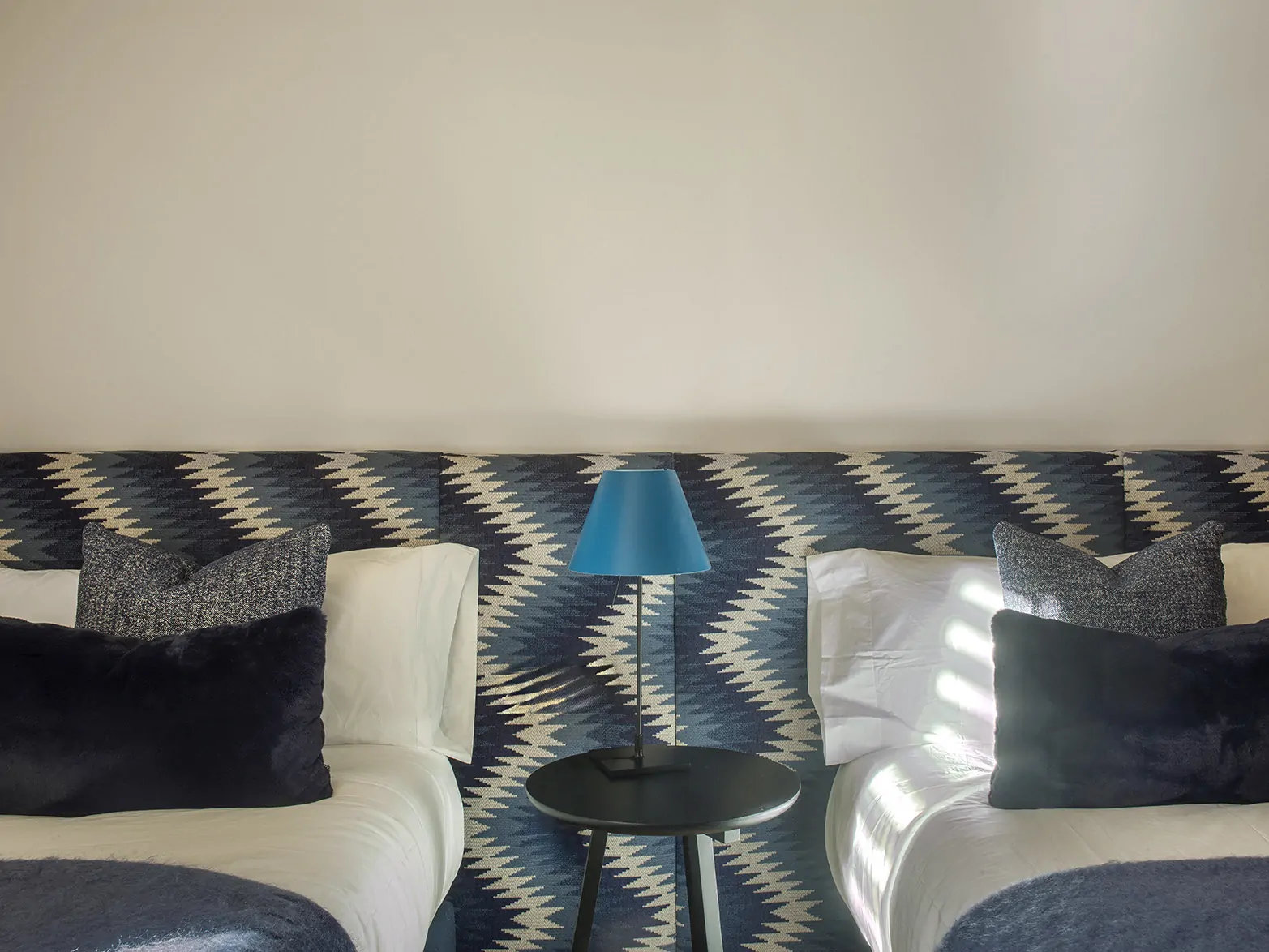 En el tercer dormitorio, dos camas individuales se apoyan en un cabezal continuo que recorre toda la pared, con cojines de James Malone y Güell Lamadrid que aportan textura y calidez.