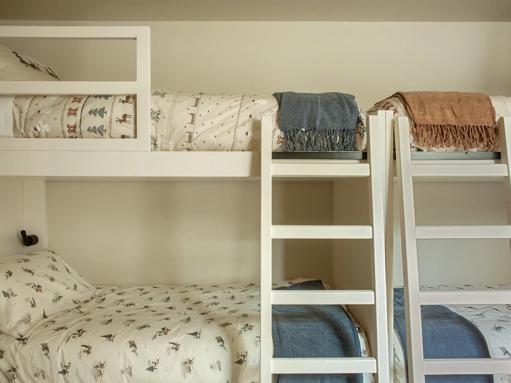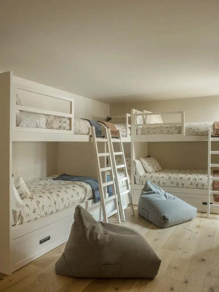 Desde esta planta se accede al nivel inferior, donde se ha pensado también en los más pequeños, con un dormitorio infantil diseñado para maximizar la capacidad sin renunciar al estilo: tres literas lacadas en crudo, con capacidad para ocho personas, se integran perfectamente con el color de las paredes. Cada cama cuenta con su propio aplique de lectura, favoreciendo la independencia de los niños y sus amigos en este espacio compartido.