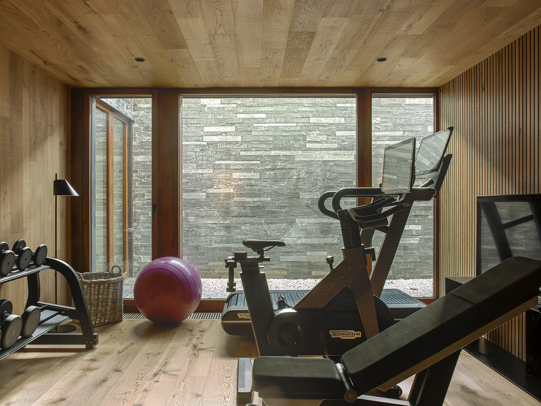En esta misma planta donde se encuentra el gimnasio, un espacio luminoso gracias a sus vistas al jardín inglés. Equipado con las máquinas de Technogym —bicicleta TG Bike, cinta TG Run, banco de pesas y juego de mancuernas de 4 a 20 kg—, el gimnasio se reviste en madera de roble para crear un ambiente cálido y acogedor que potencia el bienestar. Una lámpara de pie de Louis Poulsen completa el ambiente, equilibrando funcionalidad y diseño.
