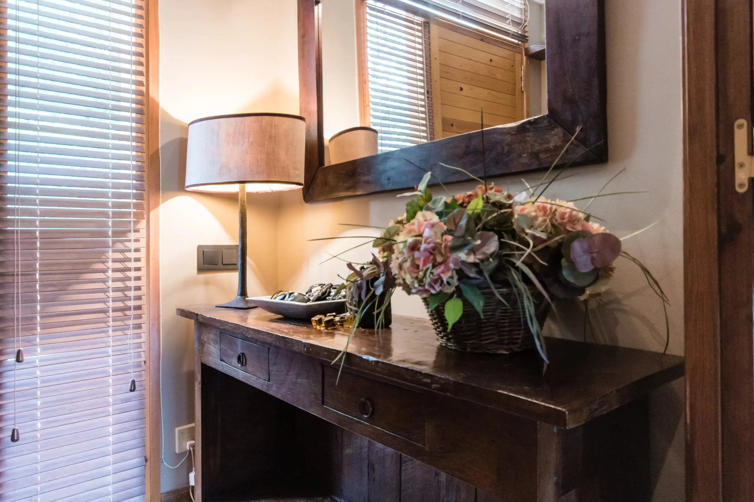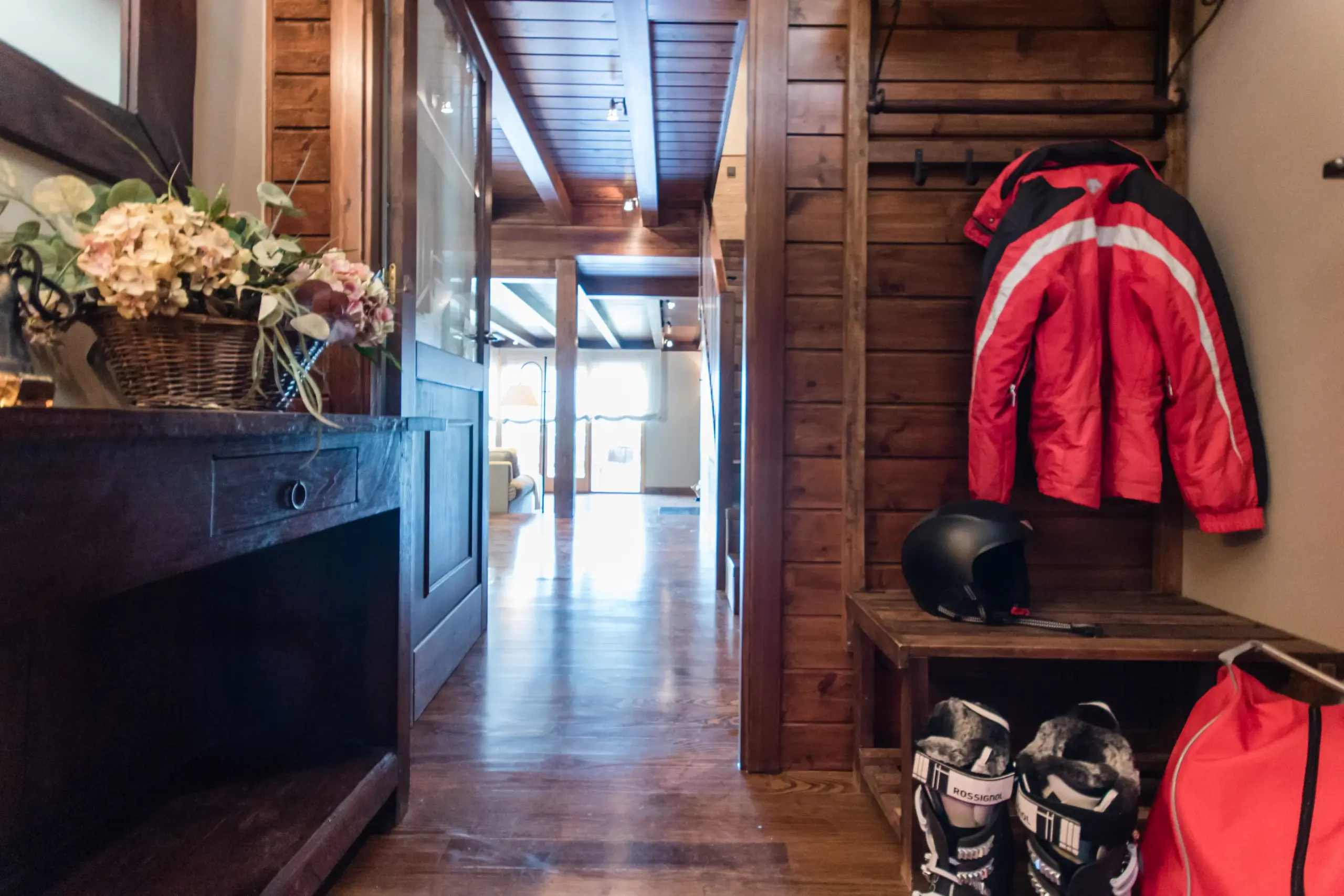 La entrada recibe al visitante con la calidez que anuncia el resto de la casa. Un aparador de madera maciza oscura de carácter rústico, con espejo de marco artesanal, sirve de apoyo a una lámpara de sobremesa de base forjada y pantalla de lino que proyecta una luz dorada y envolvente. Sobre la madera, una cesta de hortensias rosadas aporta el único toque de color suave en un espacio de tonos tierra y sombra. Al otro lado de la entrada, la zona de esquí, resuelta con ganchos de hierro sobre un panel de madera, banco a medida y soporte para esquís, cumple una función imprescindible en esta casa sin renunciar a la coherencia estética del conjunto, integrándose como si siempre hubiera formado parte de la arquitectura original.