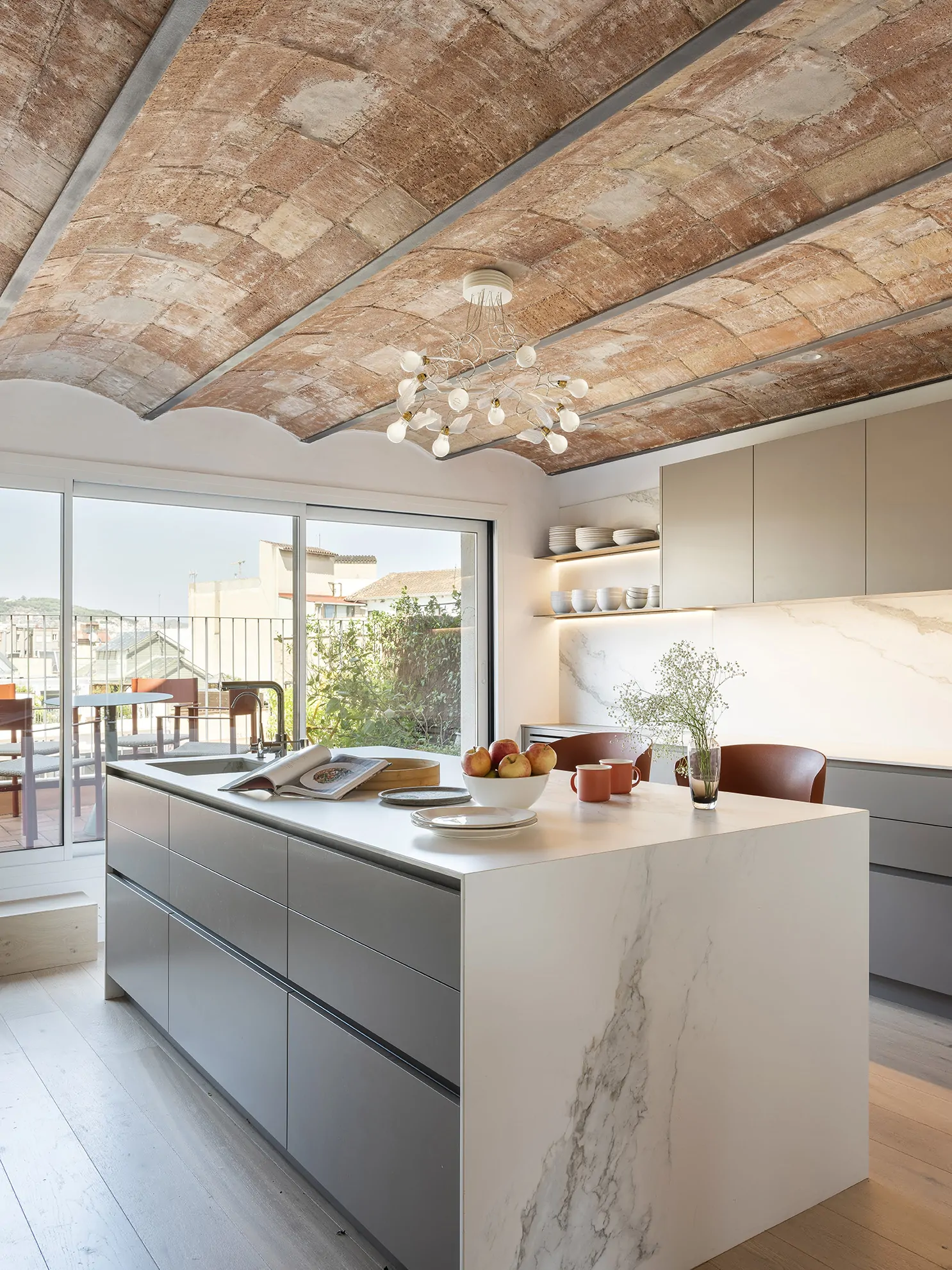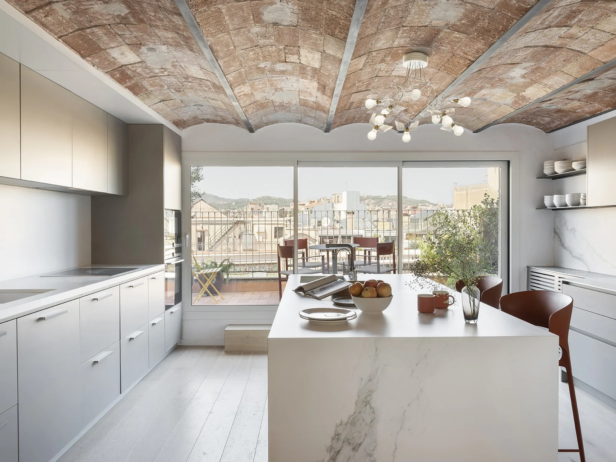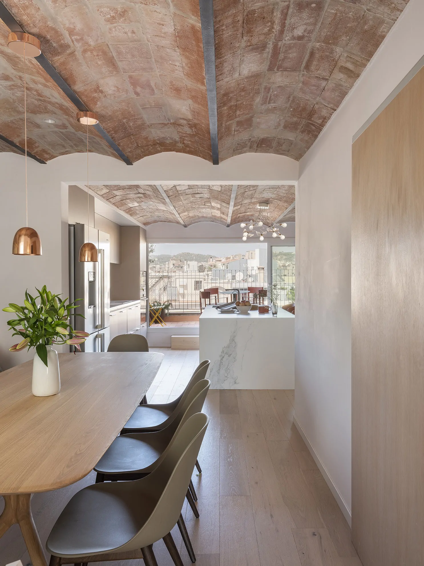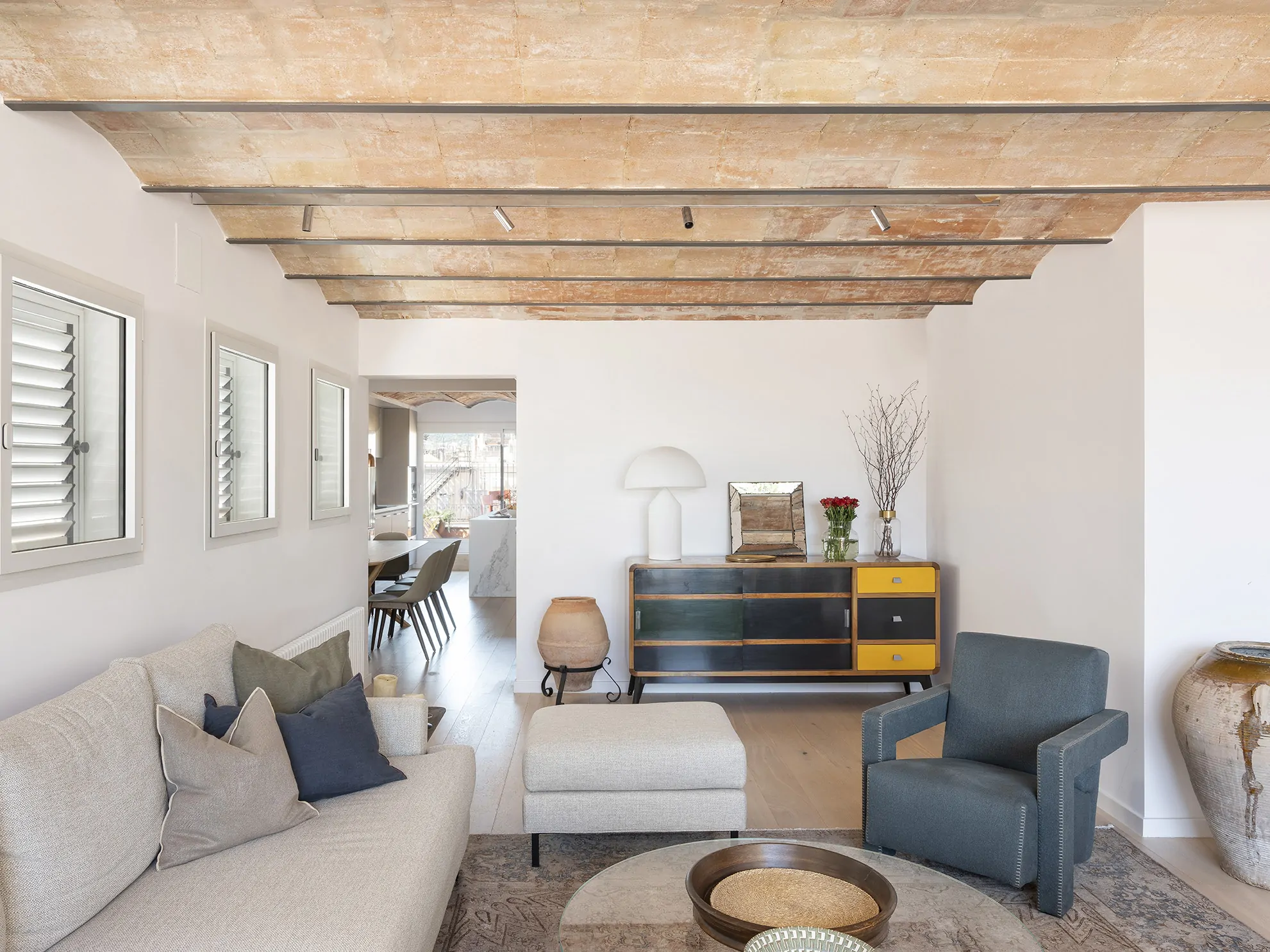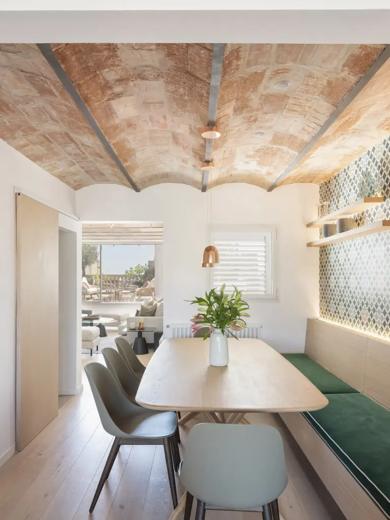 Al entrar a la vivienda, subiendo por una escalera revestida en parquet, se accede a la planta noble, donde el salón, el comedor y la cocina se abren a dos terrazas bañadas por la luz mediterránea. Aquí, las bóvedas catalanas originales han sido descubiertas, devolviéndole a la vivienda su espíritu más auténtico.