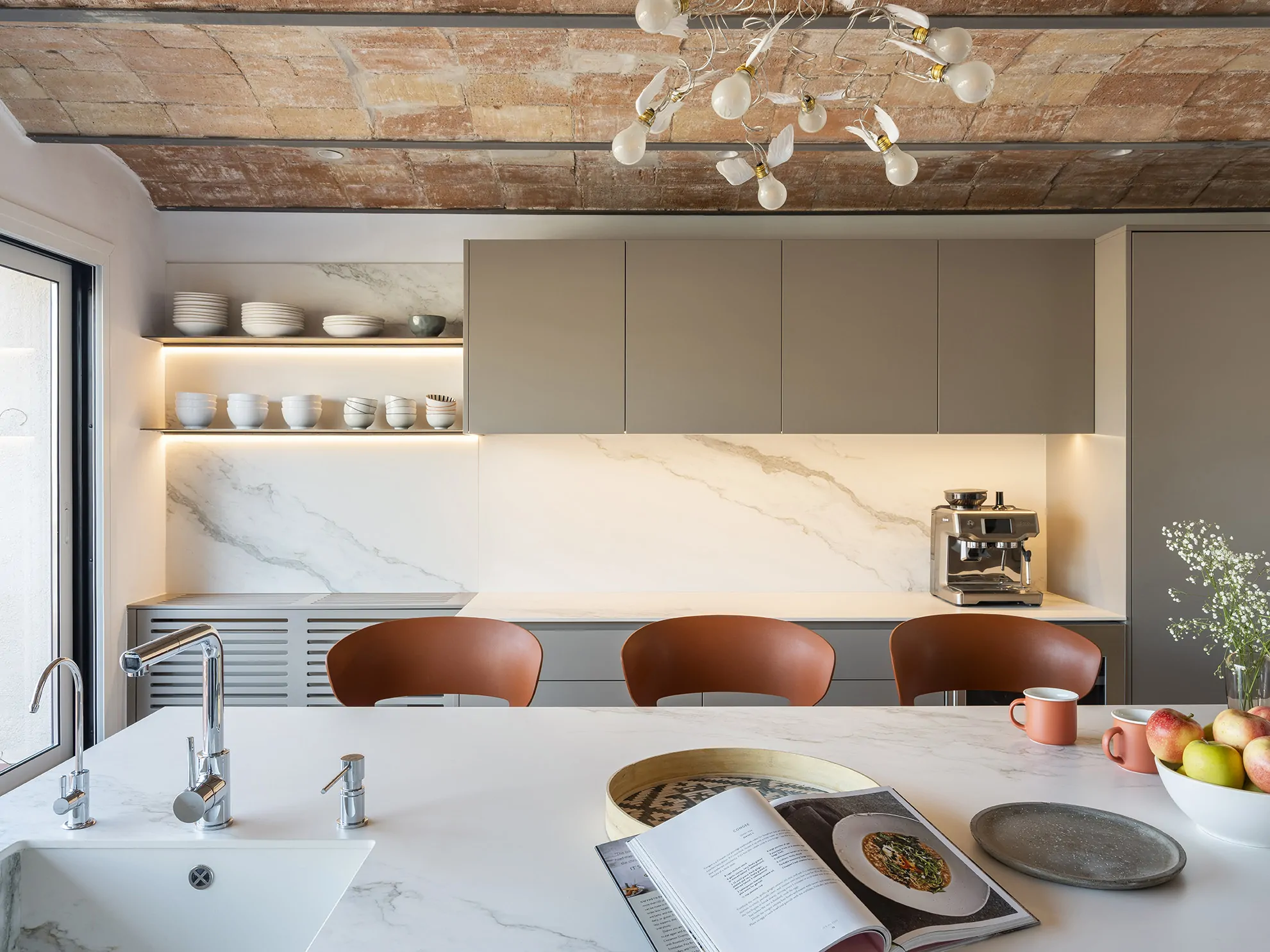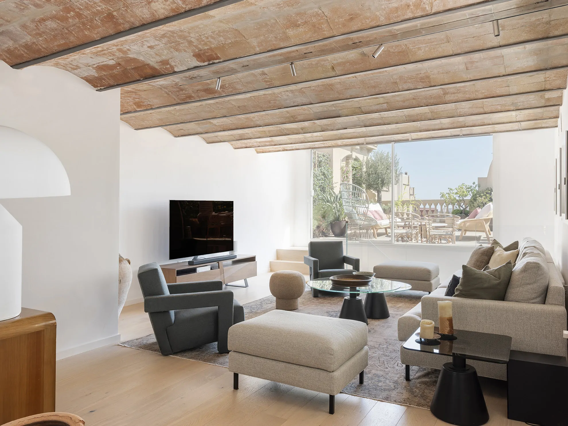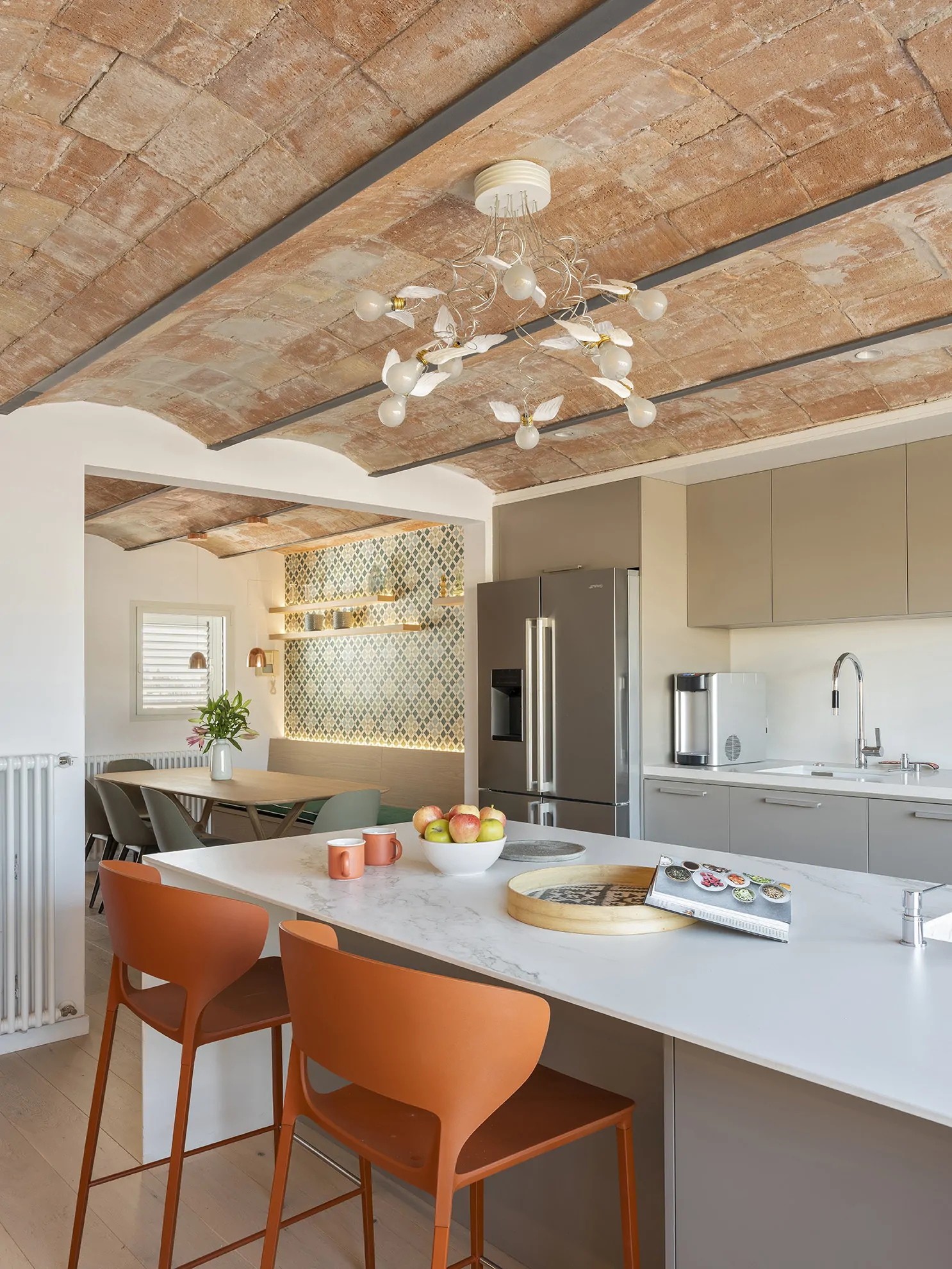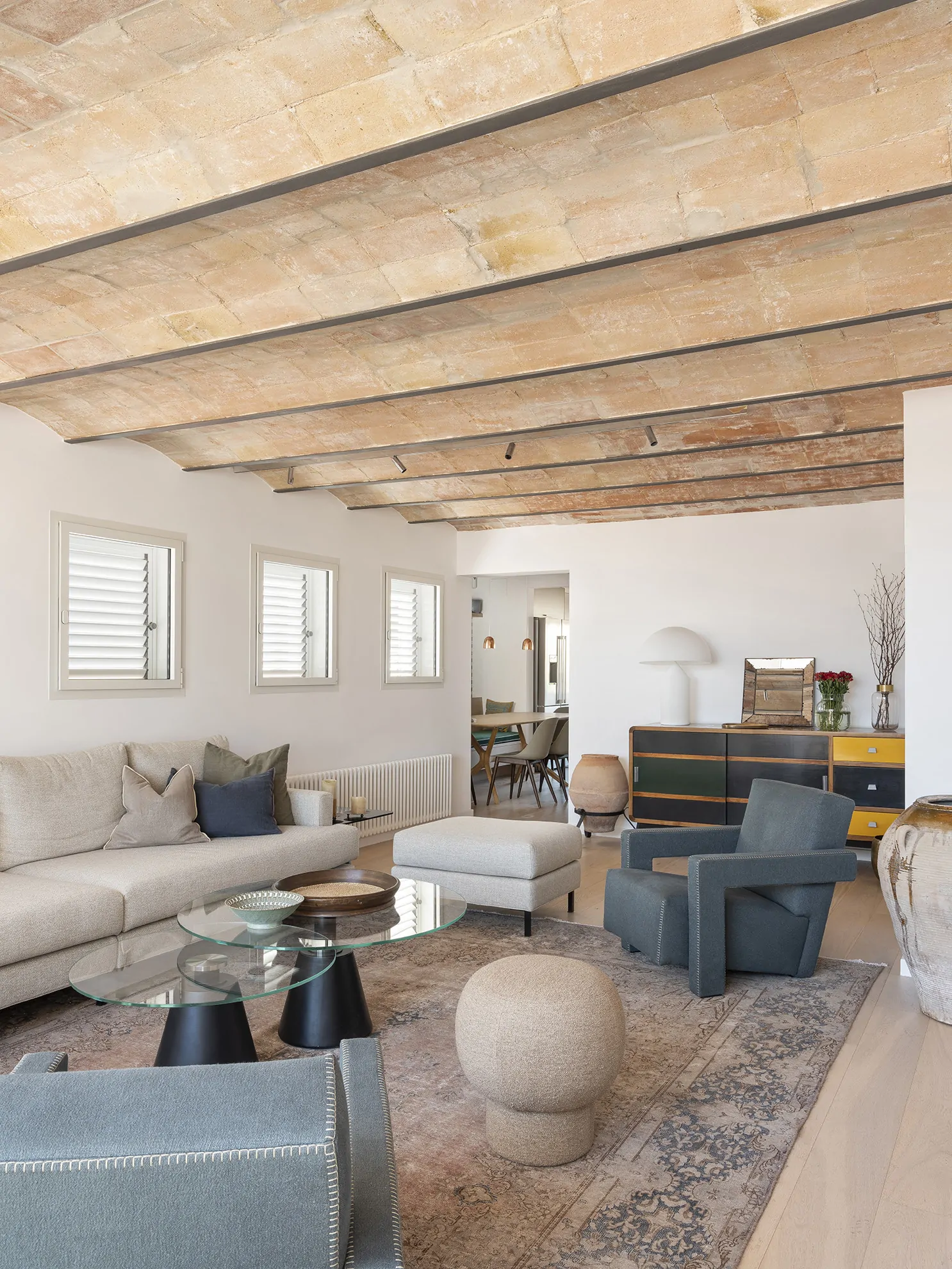 Al entrar a la vivienda, subiendo por una escalera revestida en parquet, se accede a la planta noble, donde el salón, el comedor y la cocina se abren a dos terrazas bañadas por la luz mediterránea. Aquí, las bóvedas catalanas originales han sido descubiertas, devolviéndole a la vivienda su espíritu más auténtico.
