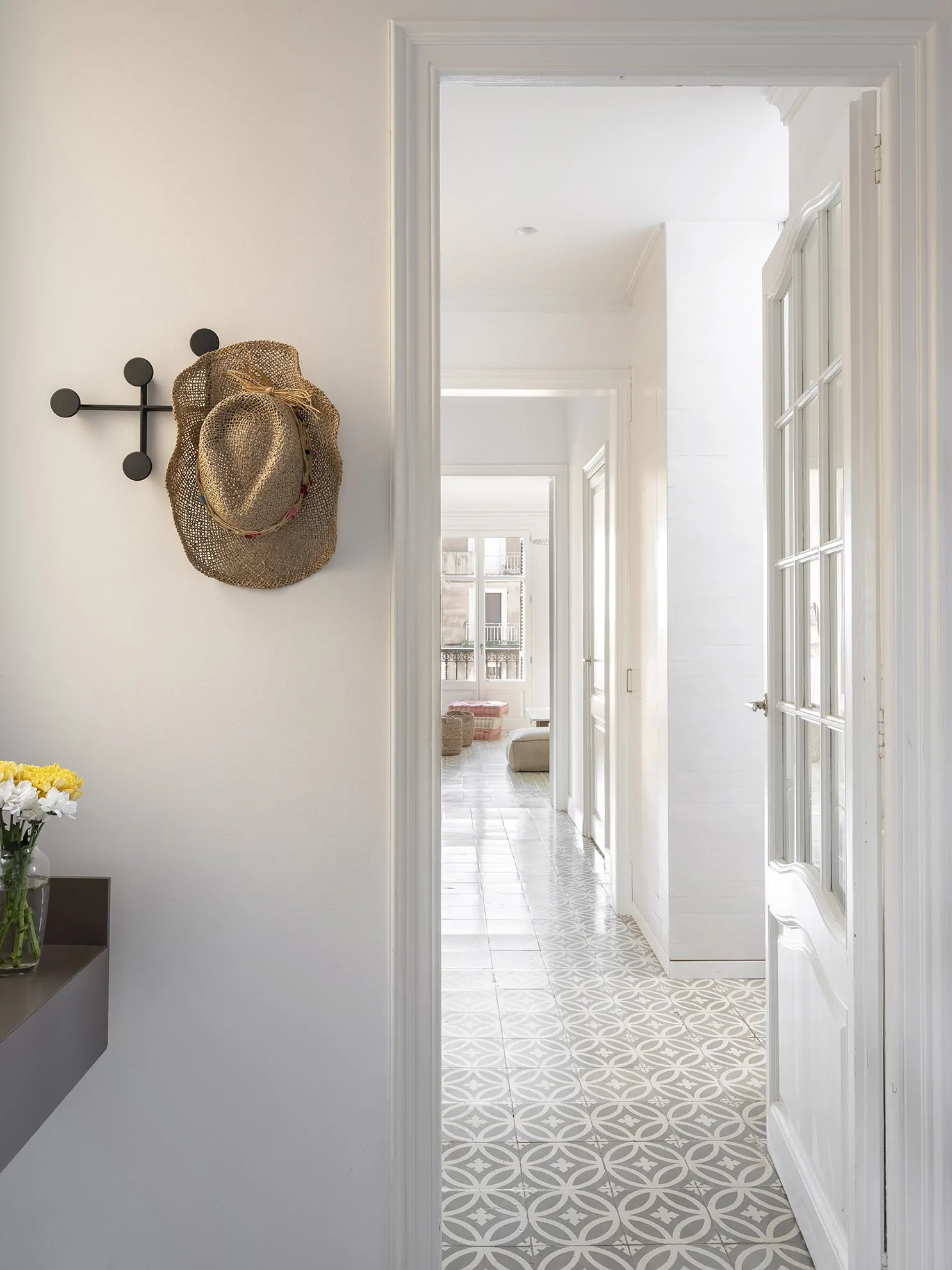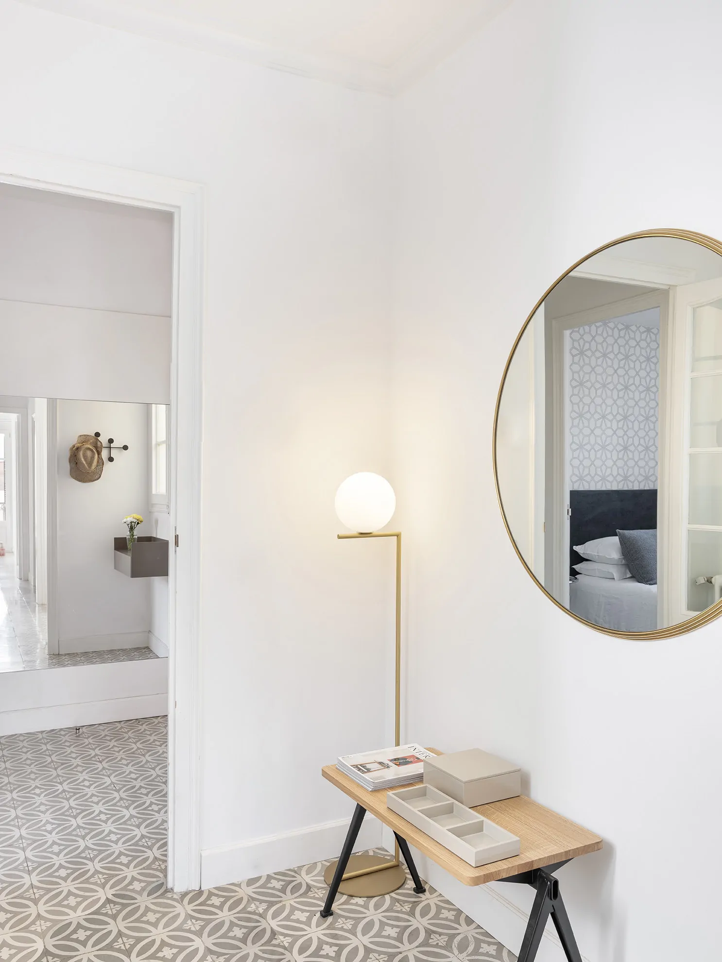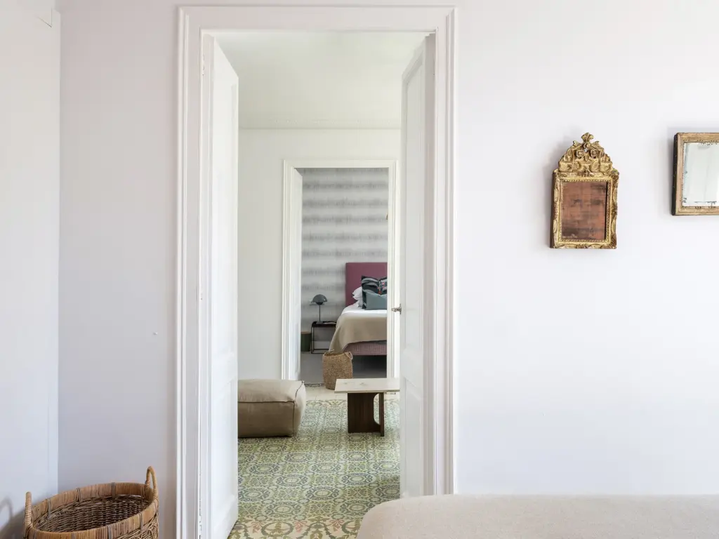 Bajando la escalera a la primera planta, en la entrada, un espejo de grandes dimensiones multiplica la luz y la profundidad del espacio. Colocado con precisión frente a la balconera del fondo, refleja el pasillo en su totalidad y crea una sensación de amplitud y continuidad. Bajo él, un mueble suspendido lacado, discreto y funcional, invita a dejar lo esencial al llegar a casa.Un distribuidor bañado en luz conecta los distintos espacios. Un espejo enmarcado en latón refleja la escalera que da acceso a la planta superior, mientras un banco con una lámpara de pie en el mismo tono termina de articular el conjunto.