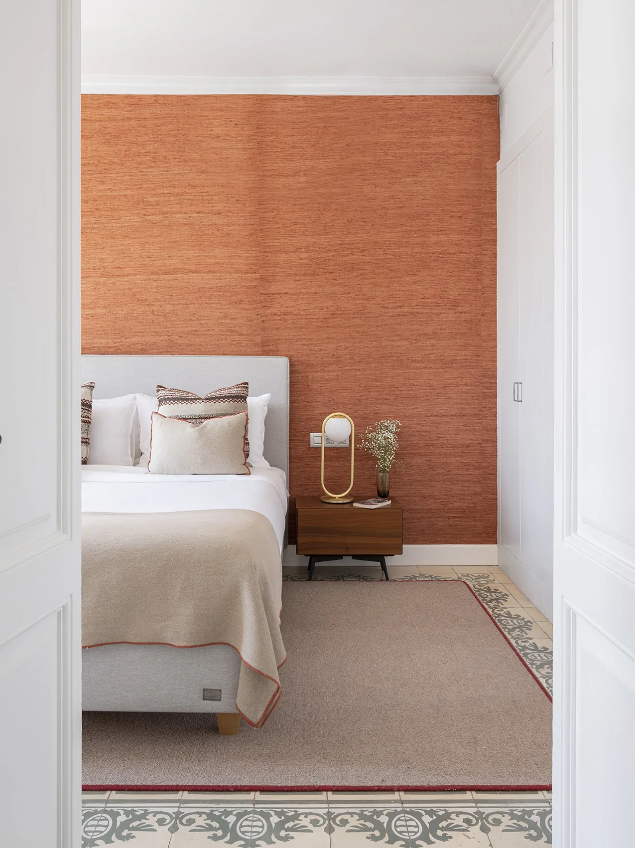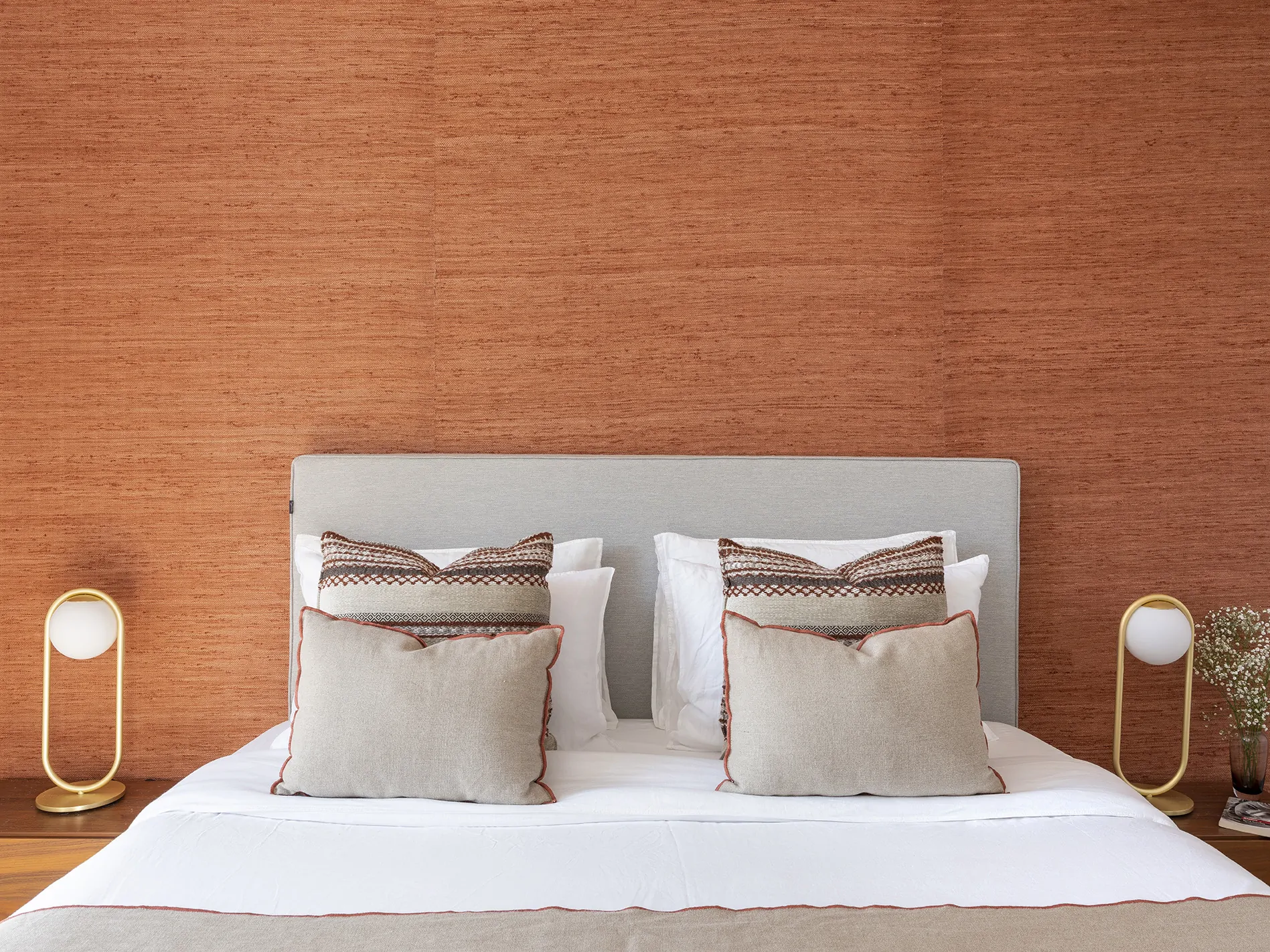 El dormitorio principal se concibe como un refugio cálido. La pared del cabecero se forra con un papel textil de Phillip Jeffries, que aporta una textura única y un tono envolvente. Frente a la cama, tres espejos antiguos estilo Louis XIV, encontrados en anticuarios de París, añaden historia y reflejos. A los lados, lámparas doradas dialogan con mesitas en acabado nogal.