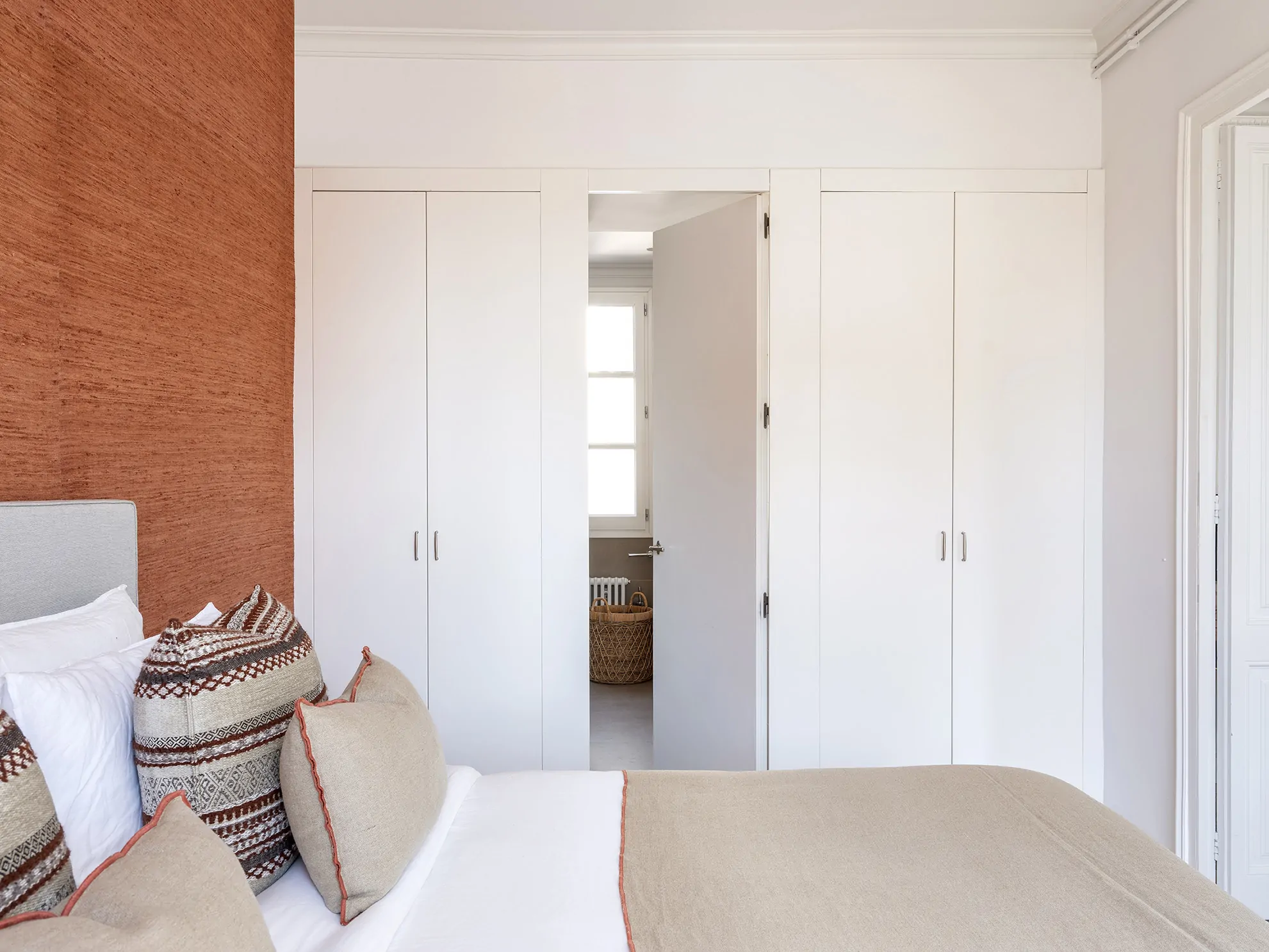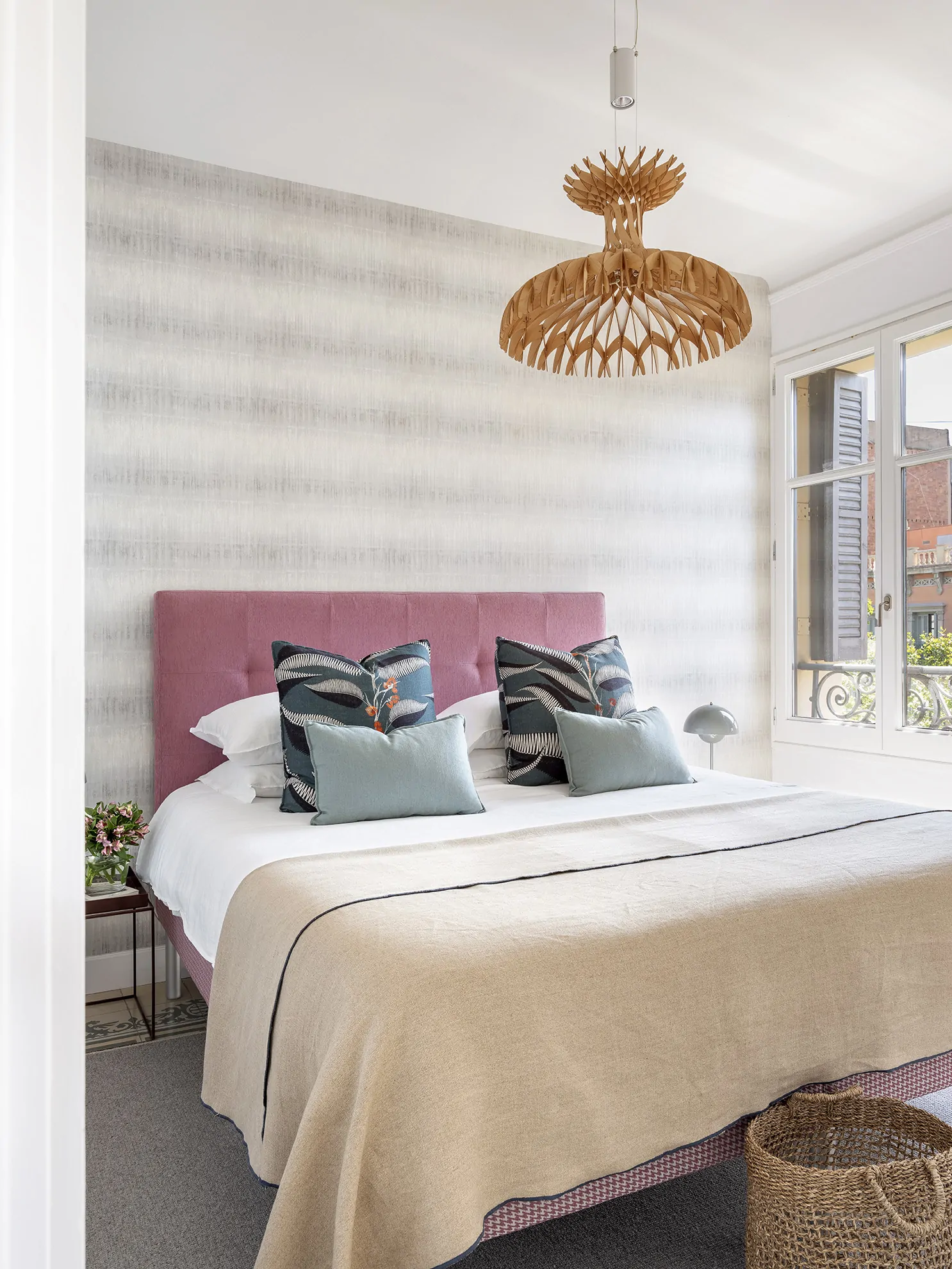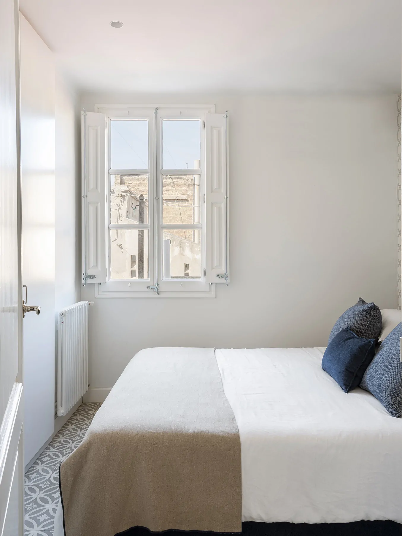 En uno de los dormitorios, el azul del cielo de Barcelona inspira la selección del papel pintado.