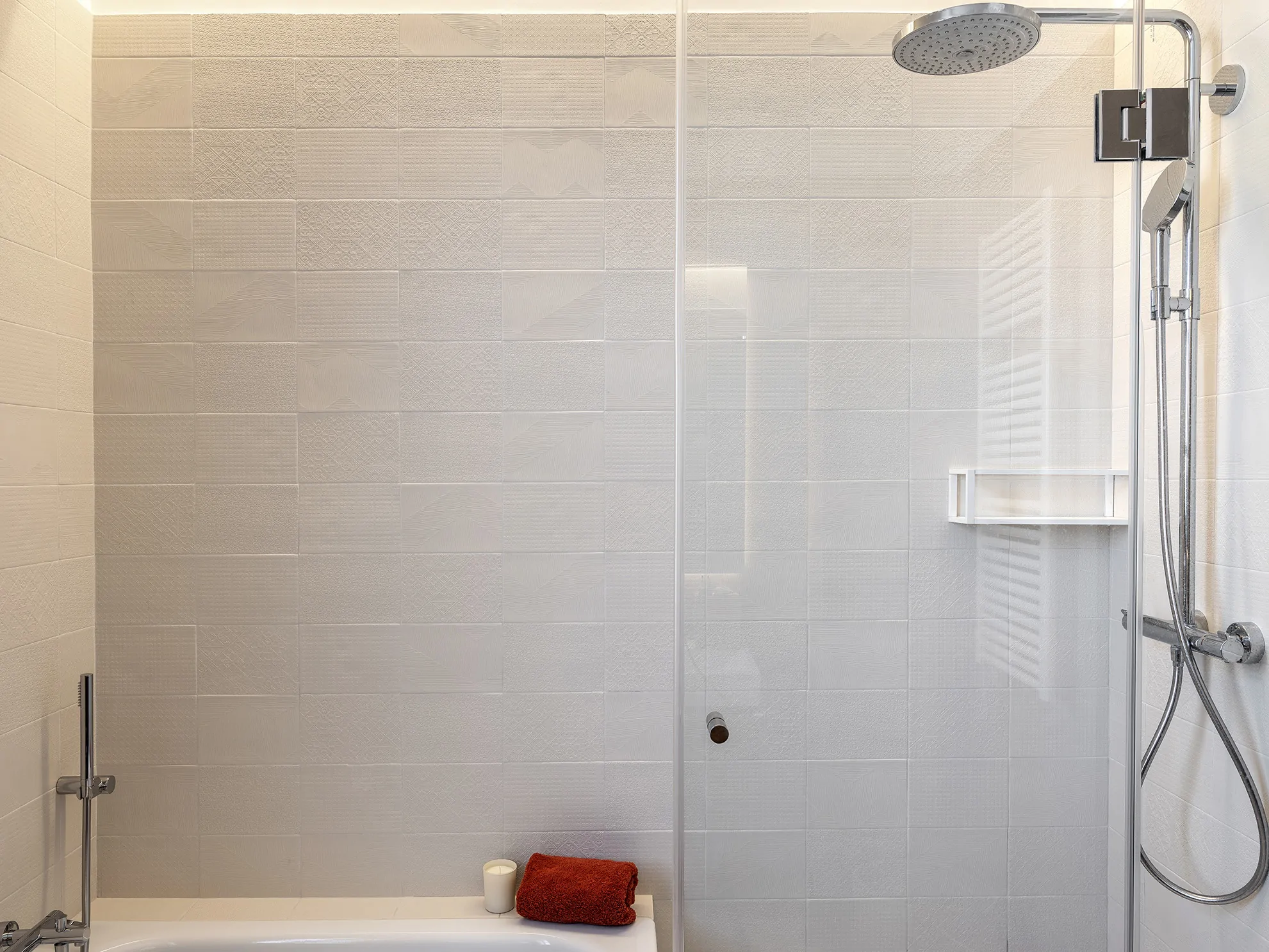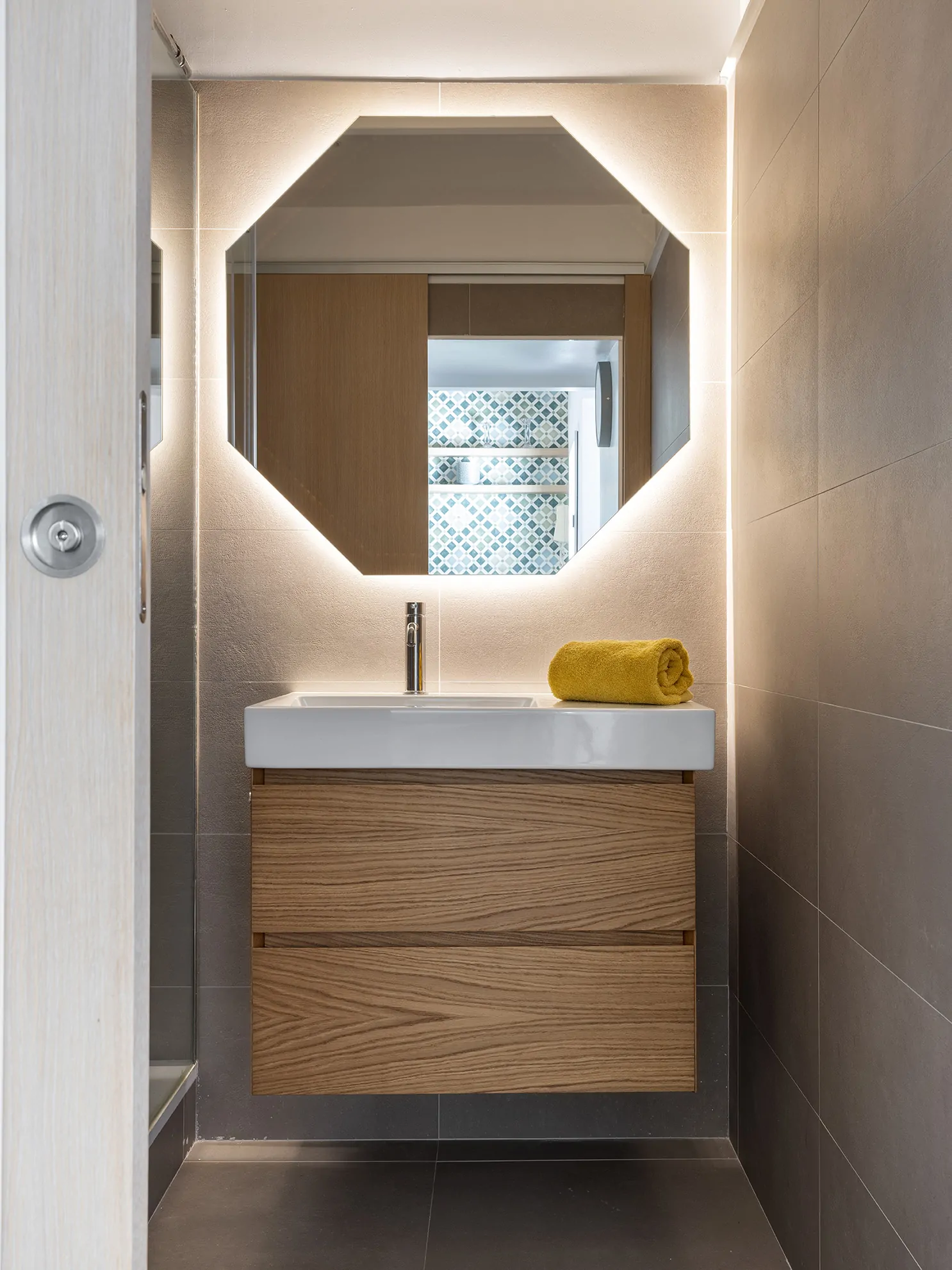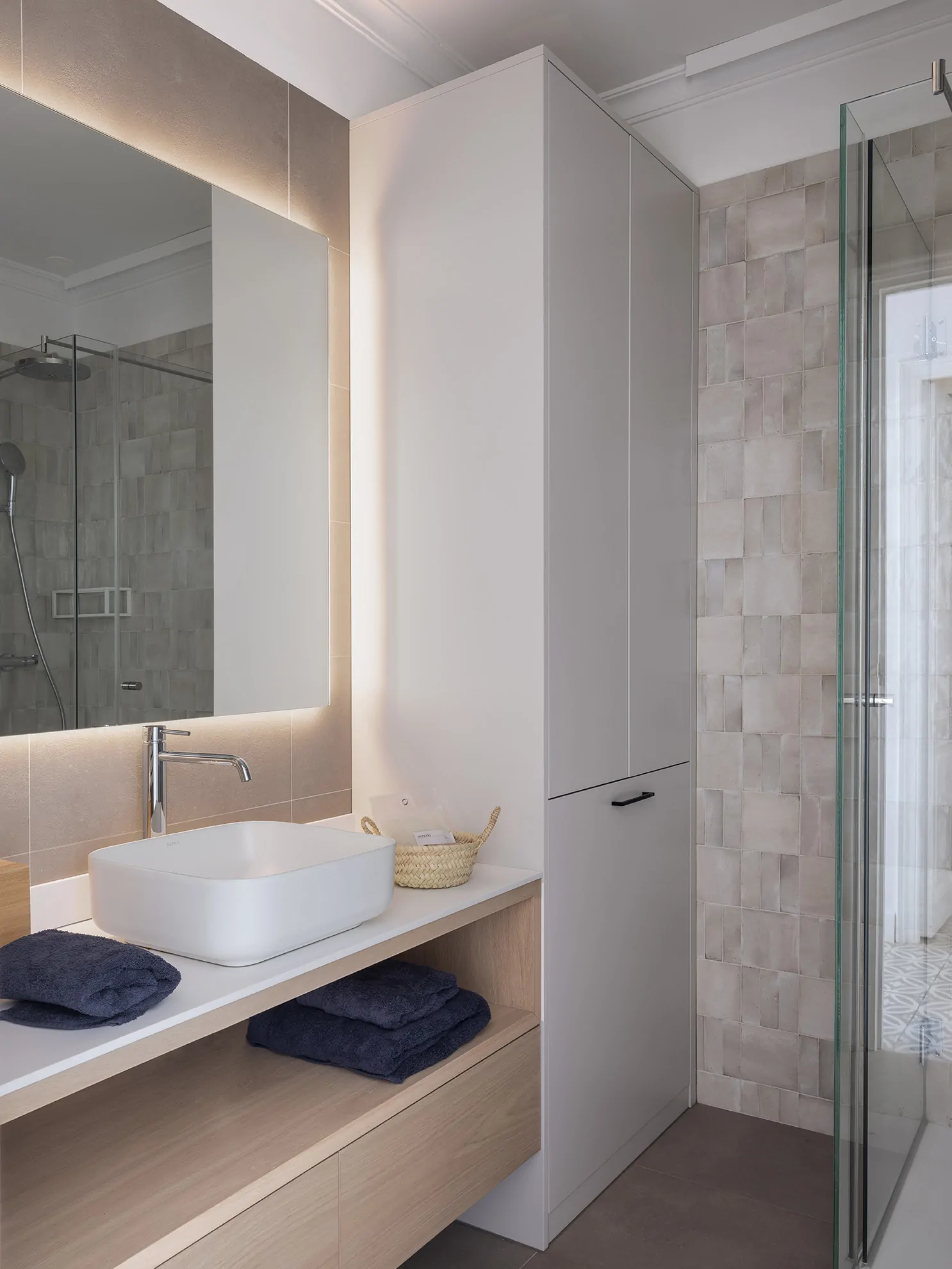 Los baños se han concebido con una estética funcional y sofisticada: mobiliario en roble natural, encimeras de Corian, espejos retroiluminados y una cuidada elección de revestimientos que combinan distintos formatospara sumar textura y ritmo visual.