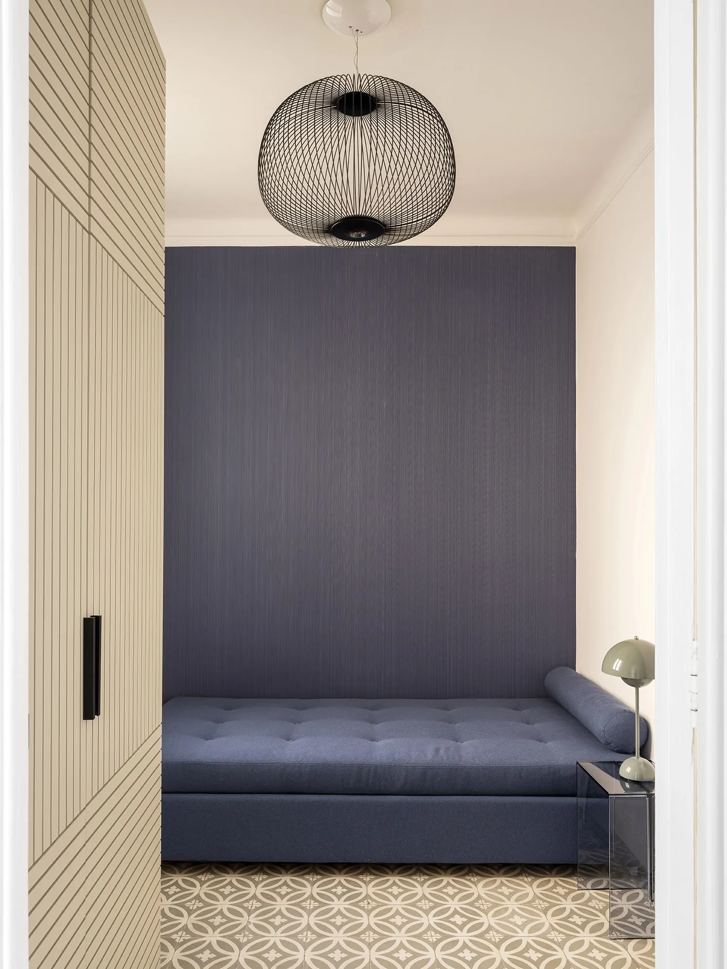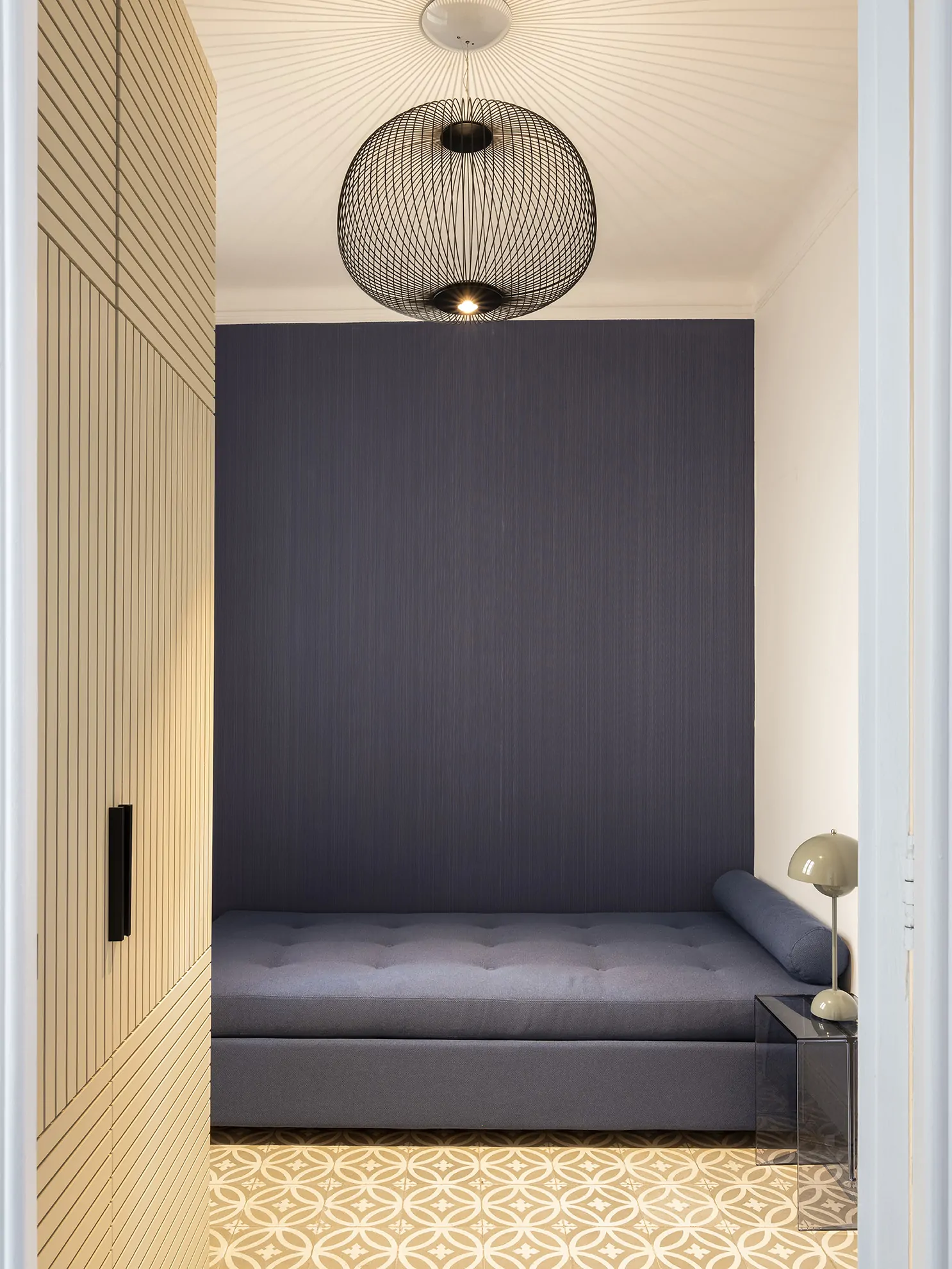En uno de ellos, un papel pintado vibrante viste la pared del cabecero, diseñado a medida junto al canapé. Los tonos azules marcan el ritmo cromático, desde la mesita de noche hasta los textiles que se despliegan con elegancia a los pies de la cama. En otro, un papel lavable cubre la pared principal mientras un moderno sofá cama convierte el espacio en un híbrido entre estudio y dormitorio. Las puertas del armario, con un juego visual entre rayas verticales y horizontales, aportan una dosis de dinamismo y carácter.