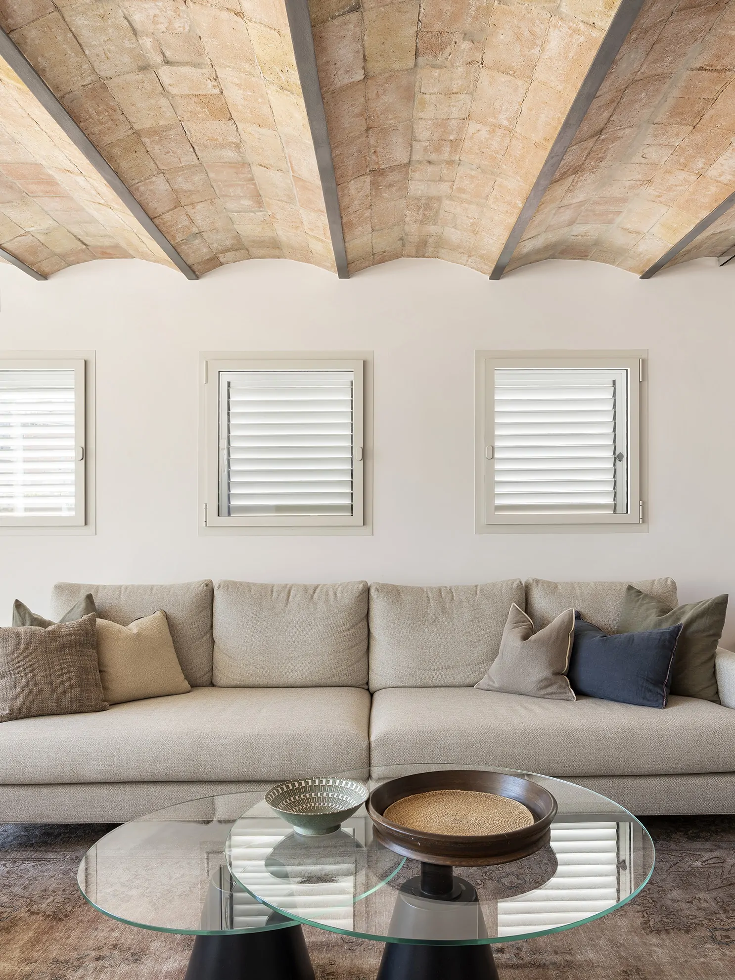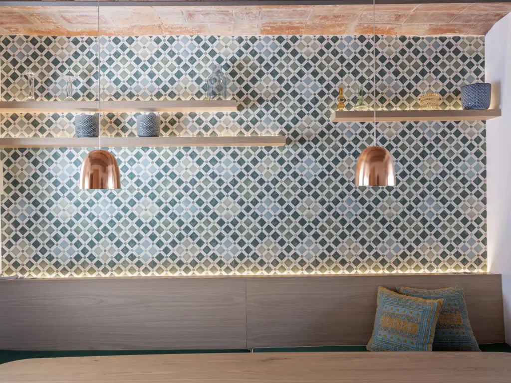 El proyecto respeta con delicadeza la estructura original del edificio: los techos recuperan la volta catalana, los pavimentos hidráulicos han sido restaurados con mimo y la carpintería realizada íntegramente en madera maciza, reproduce el diseño original, aportando autenticidad y calidez a cada rincón.